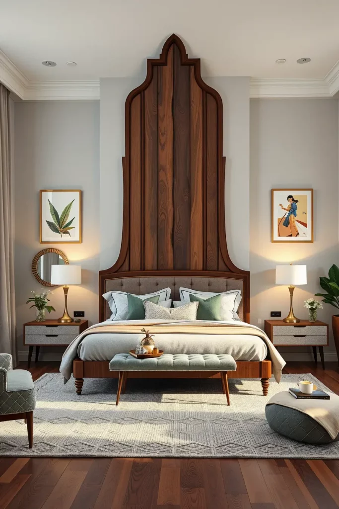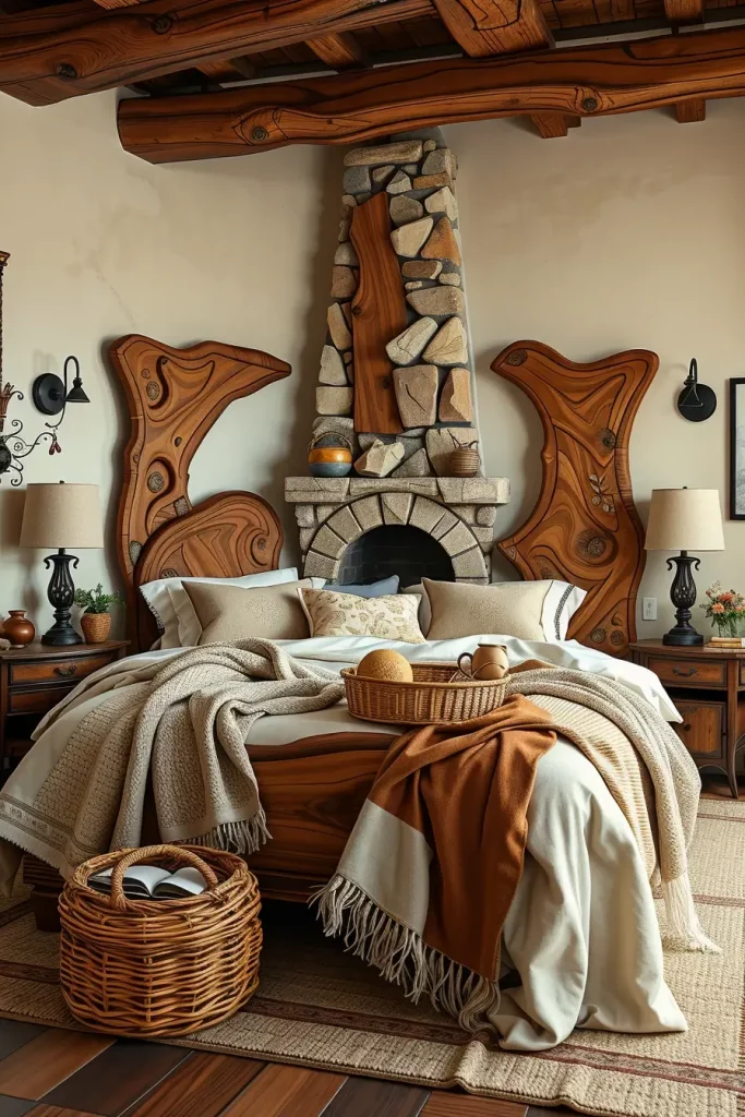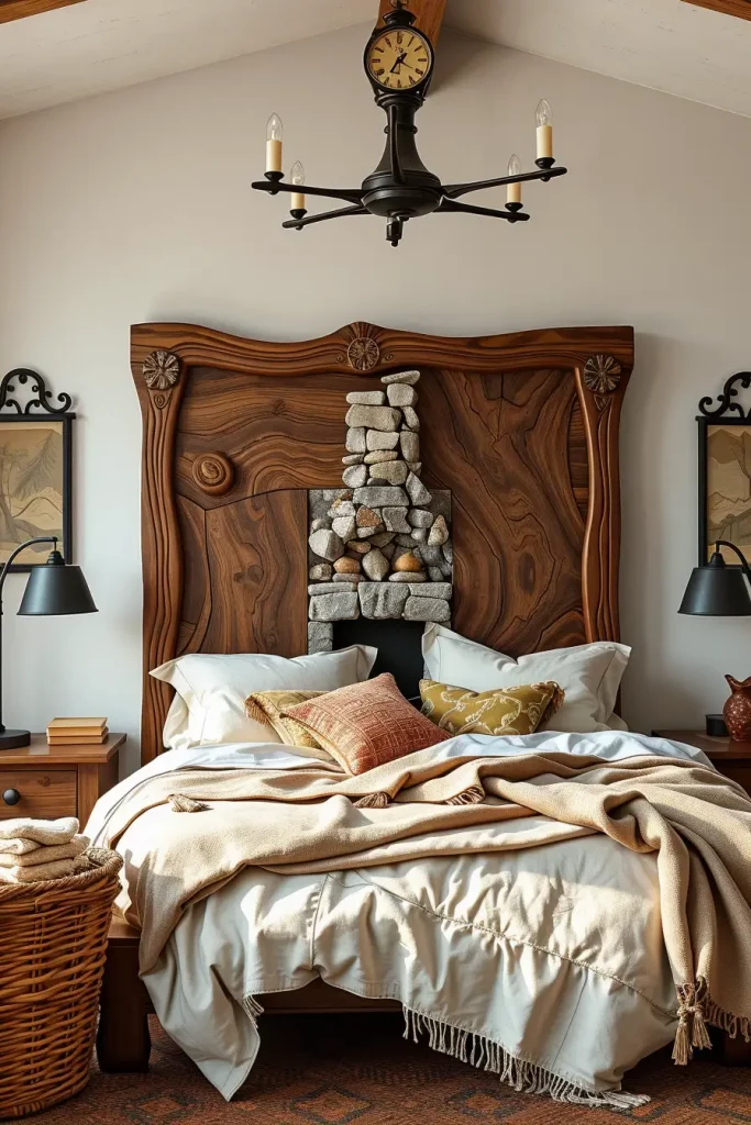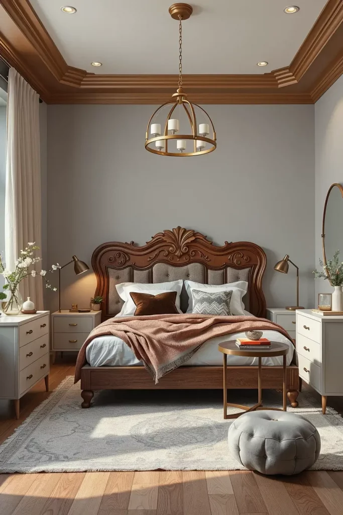 I tend to combine fancy woodwork with less fancy accessories. As an example, a carved oak headboard with curved patterns would be ideal on a dull painted wall and brass lighting fixtures would accentuate the natural finish of the wood. The selection of polished wood tones balances the rustic essence of woodwork and the sophistication that a bedroom needs.
