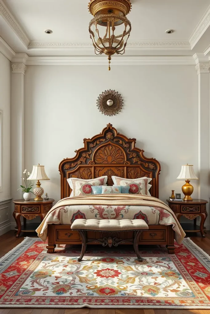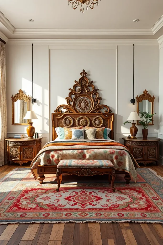 To take this styling up a notch, think about including accent mirrors in carved wooden frames or a decorative rug in traditional motifs. These items are reminiscent of the design of the headboard but they also add to the ambiance of the room.