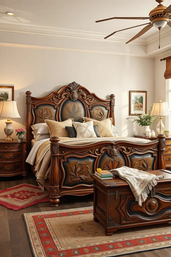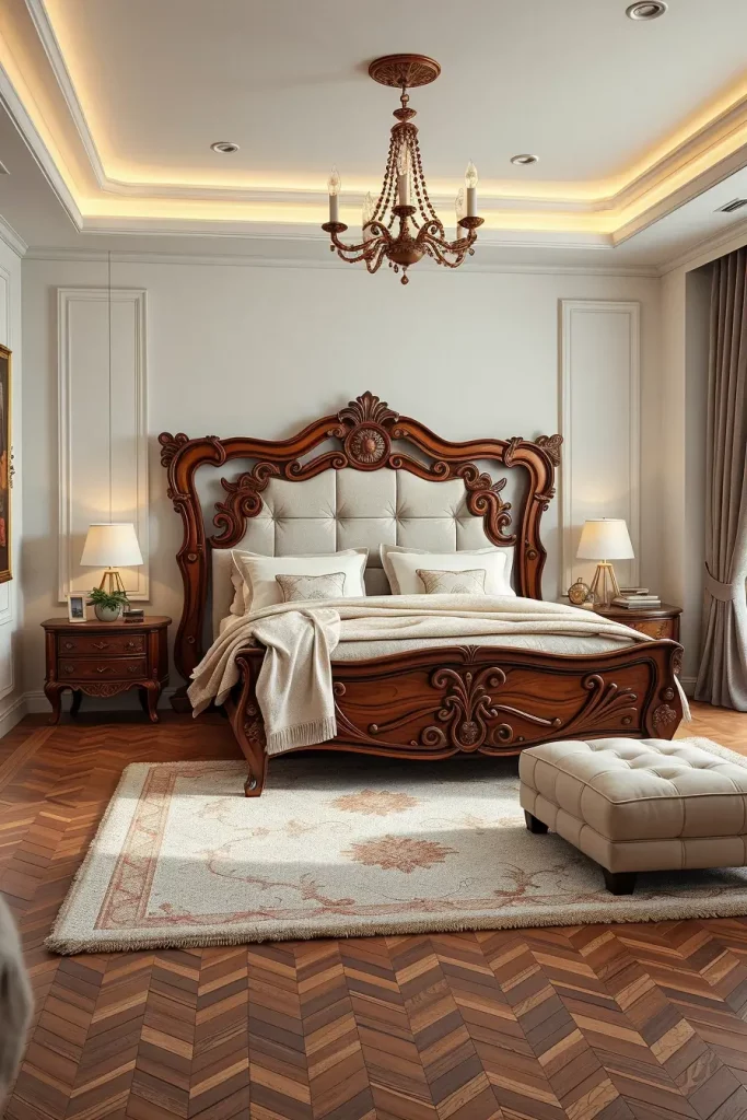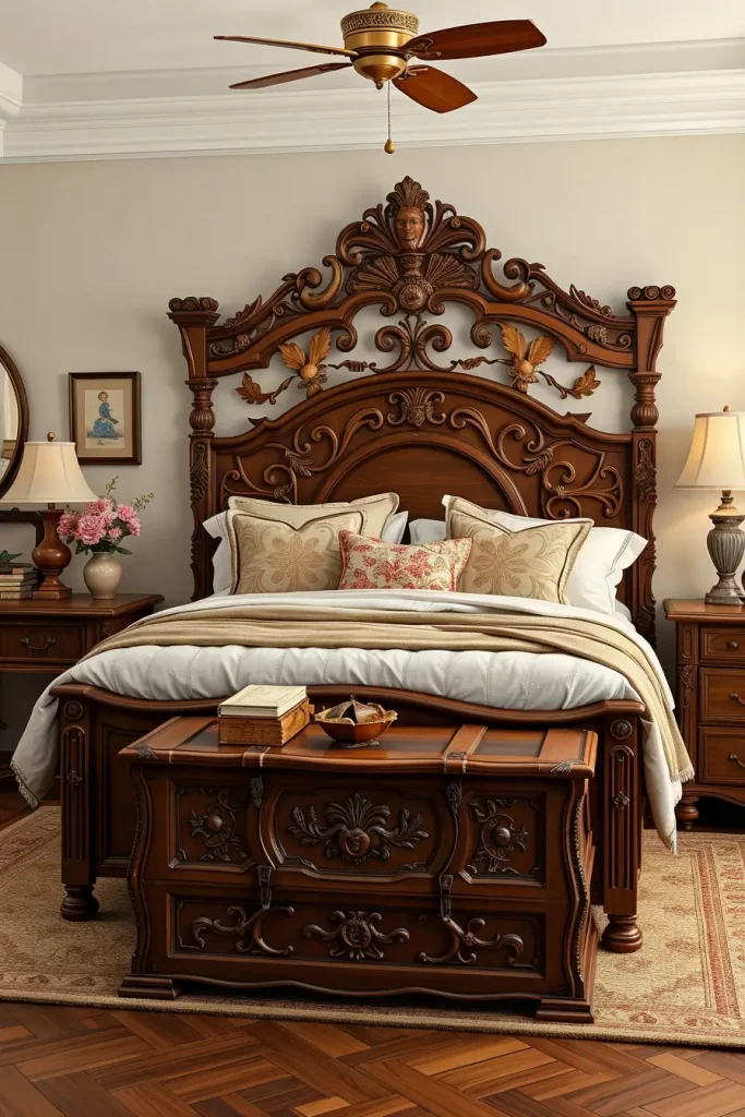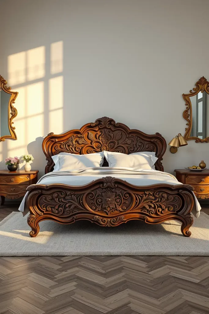 I tend to balance carved bed frames with more soft accents so that the room does not get too busy. As an example, the carving details stand out against neutral bedding, muted curtains, and subtle rugs. The side furniture is matched in lighter colors, which provides the balance, without losing the dominance of the frame.