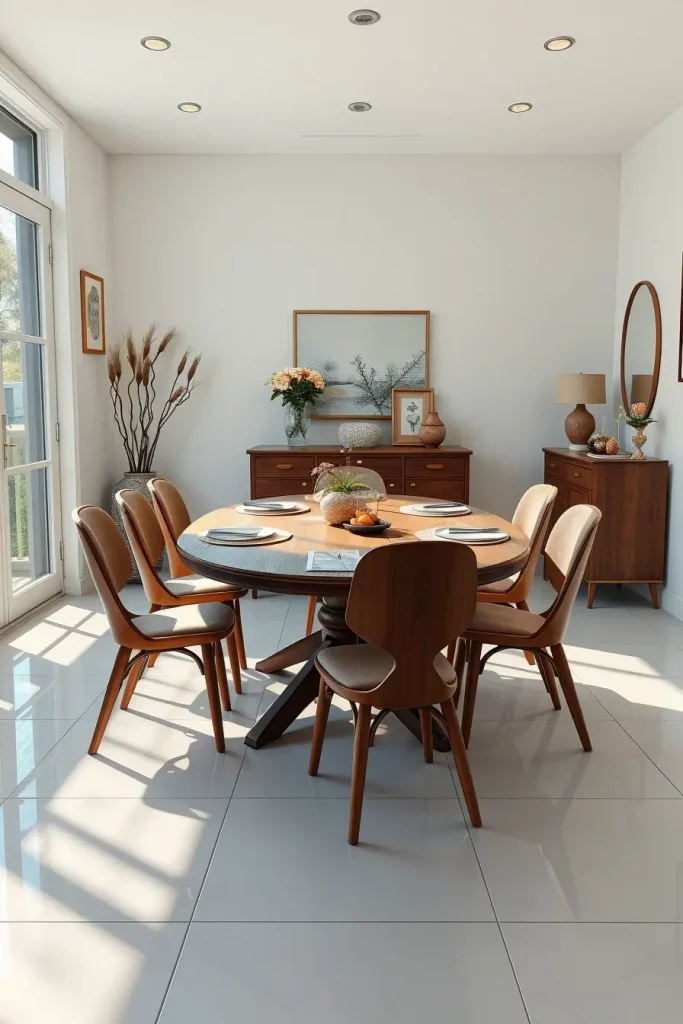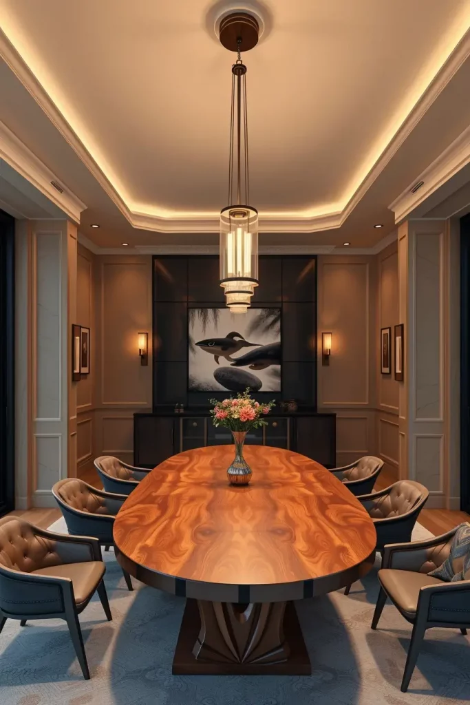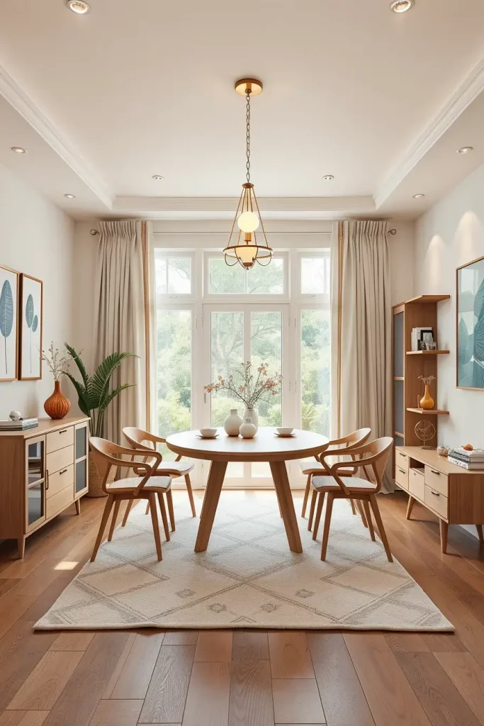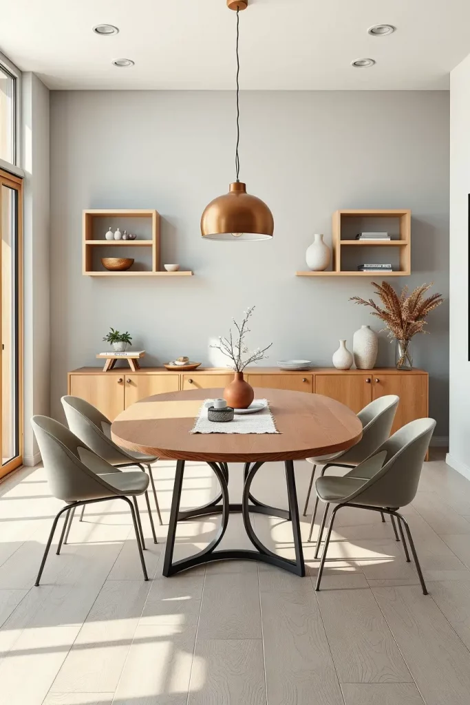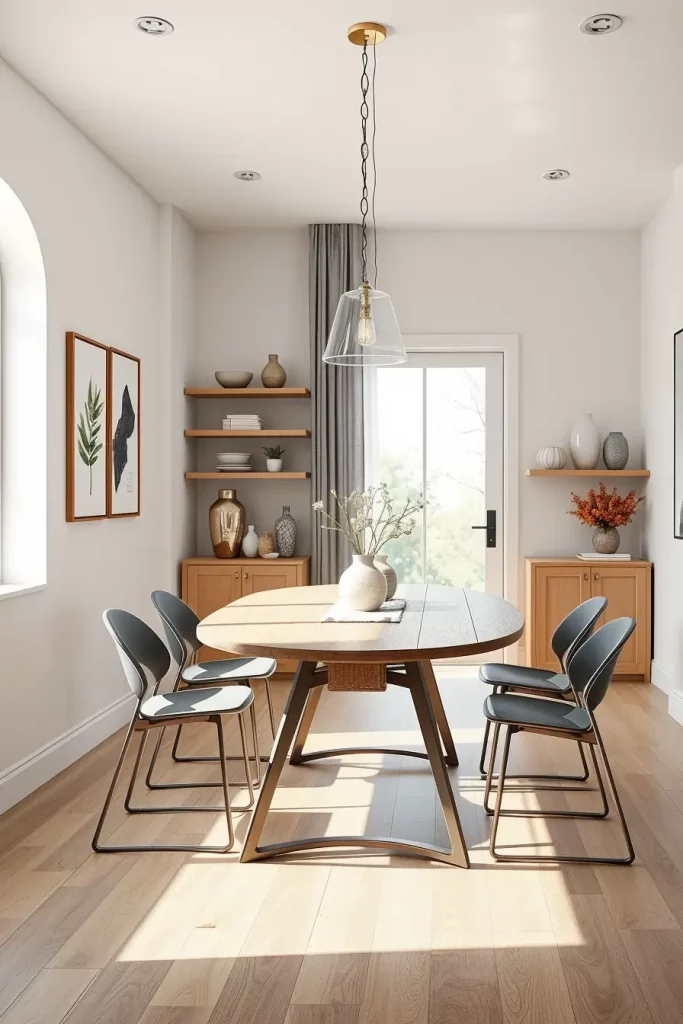 In this kind of design, I would like to have a solid wood oval table with a thin base or metal legs with a dull finish. The combination of the smooth dining chairs in natural materials or leather gives the entire appearance a refined yet welcoming feeling. The vision is finished with neutral walls, uncluttered shelves and soft pendant lighting, leaving the space airy and functional.