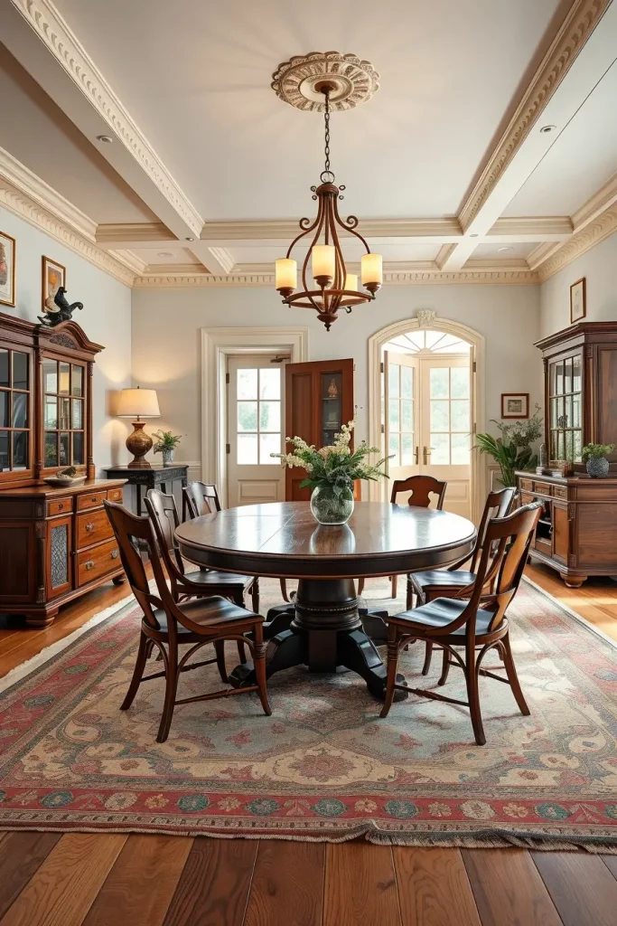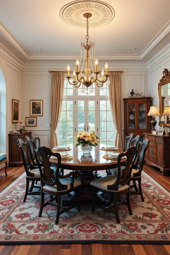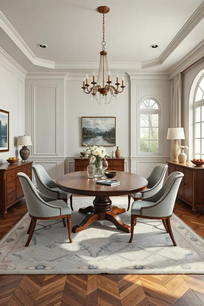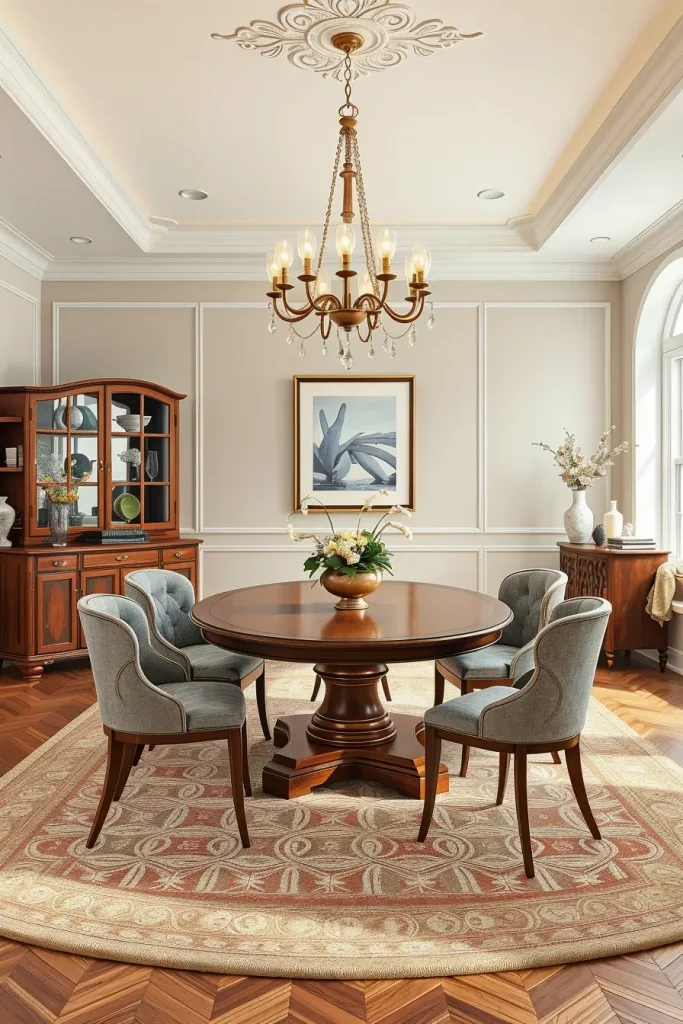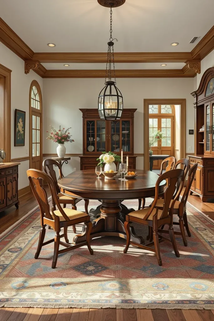I use the table combined with upholstered chairs with carved wooden legs, traditional area rugs and statement chandeliers with crystal or brass details to create a traditional set. The room can be finished with a matching wooden buffet or hutch that provides useful storage of dinnerware and linens.