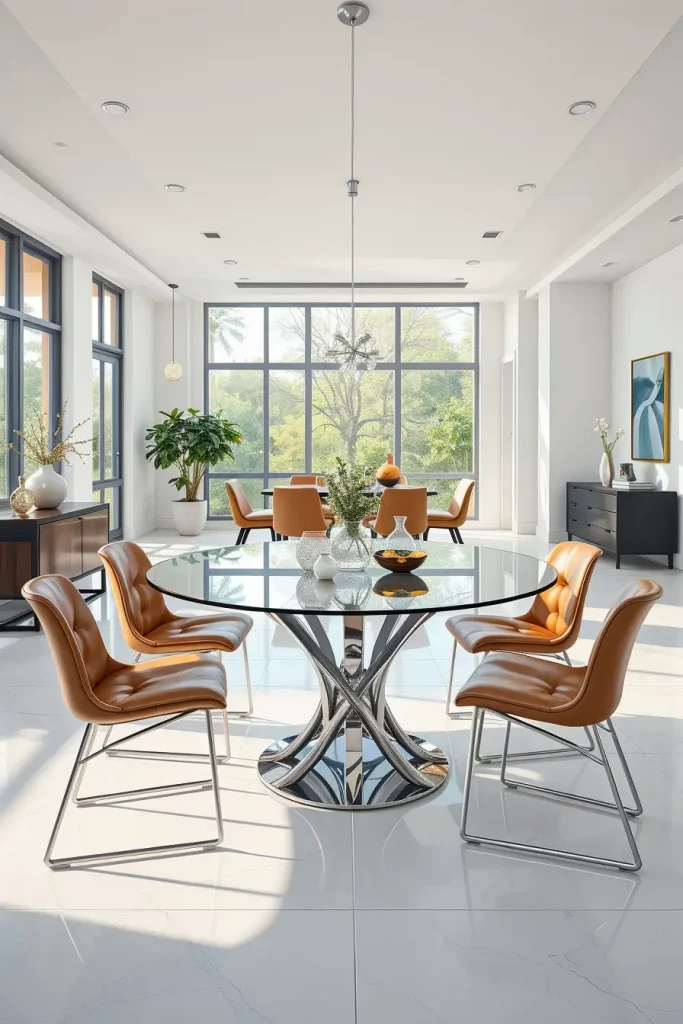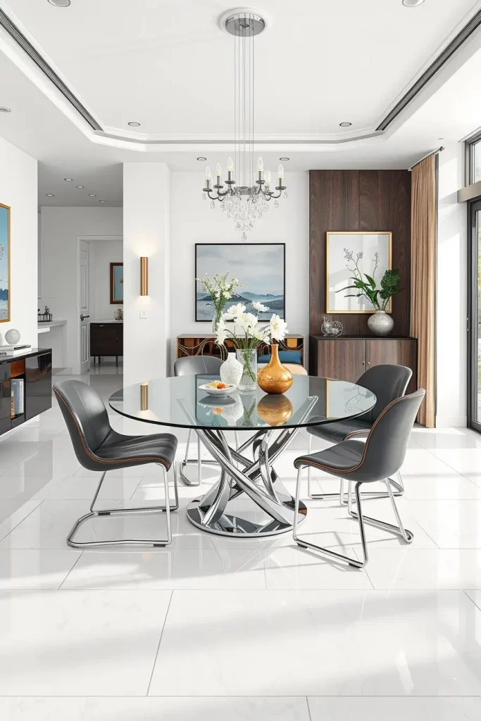 To have a refined appearance, I combine glass-top tables with thin, contemporary chairs made of chrome, acrylic, or leather. The table foundation may be a sculptural object on its own – polished metal to a work of art wooden frame. Tabletop minimalist decor such as one vase or low centerpiece is the most effective to ensure the style is refined.