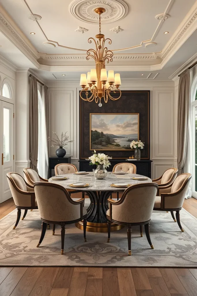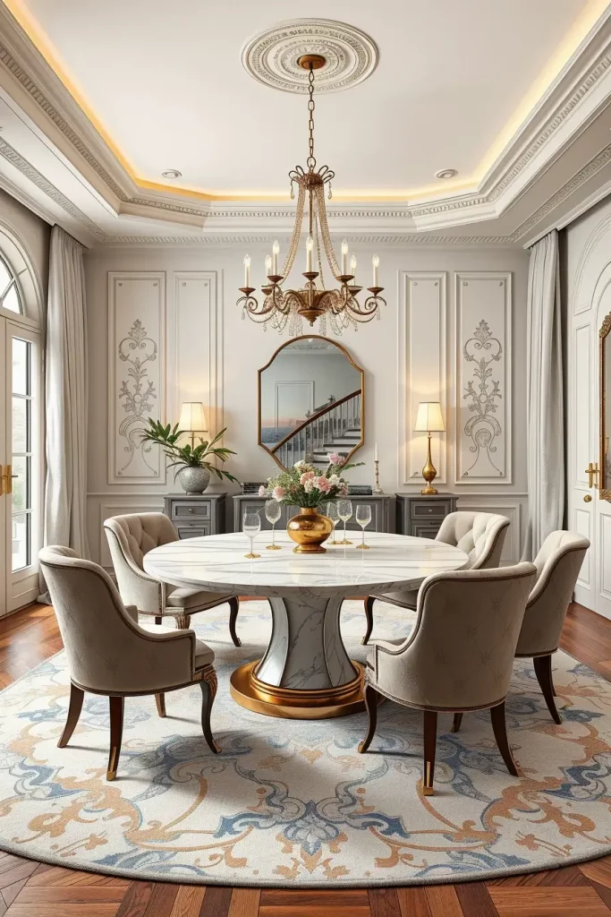 To make it more elegant, I usually suggest combining marble tables and upholstered chairs, some metal details in gold or brass, and multiple lighting. The table is grounded with a soft area rug in a muted tone, which does not take away the beauty of the table.