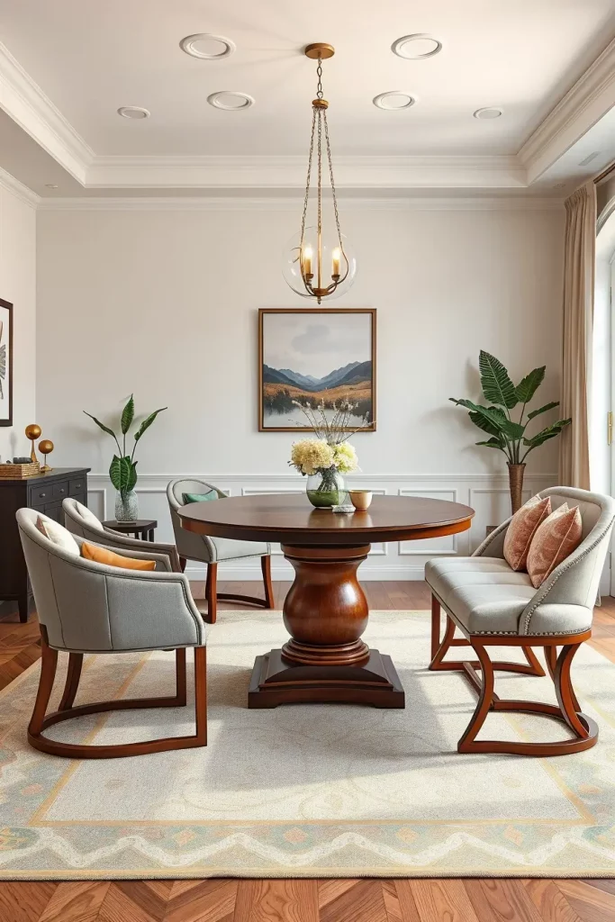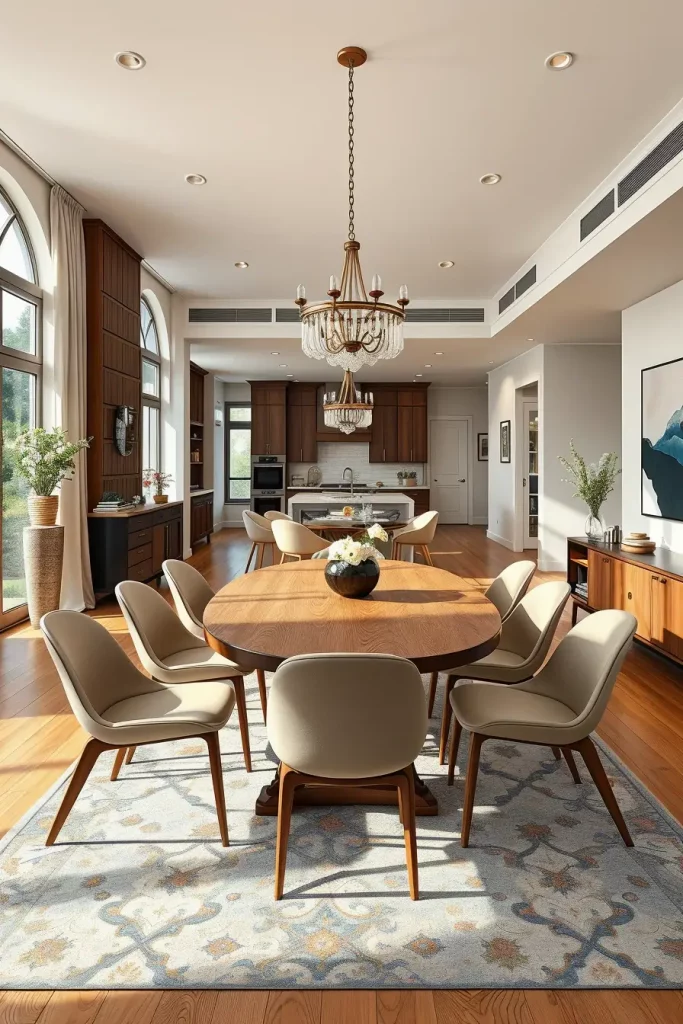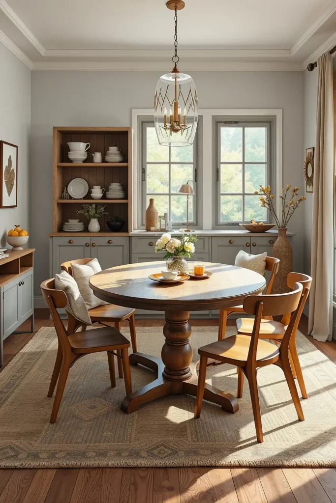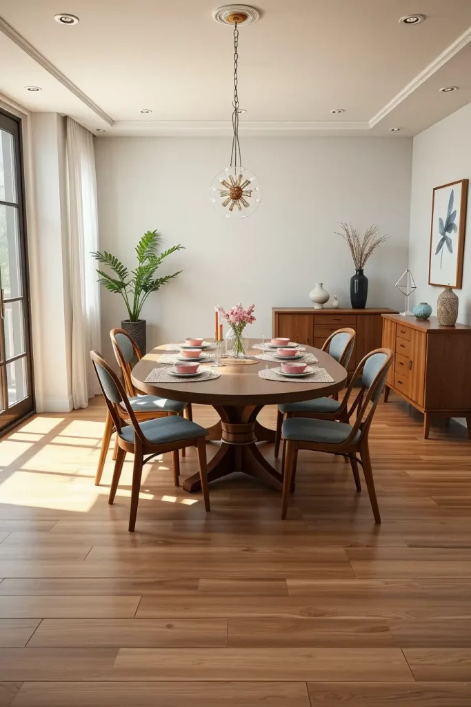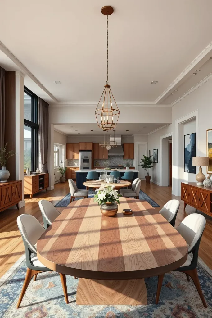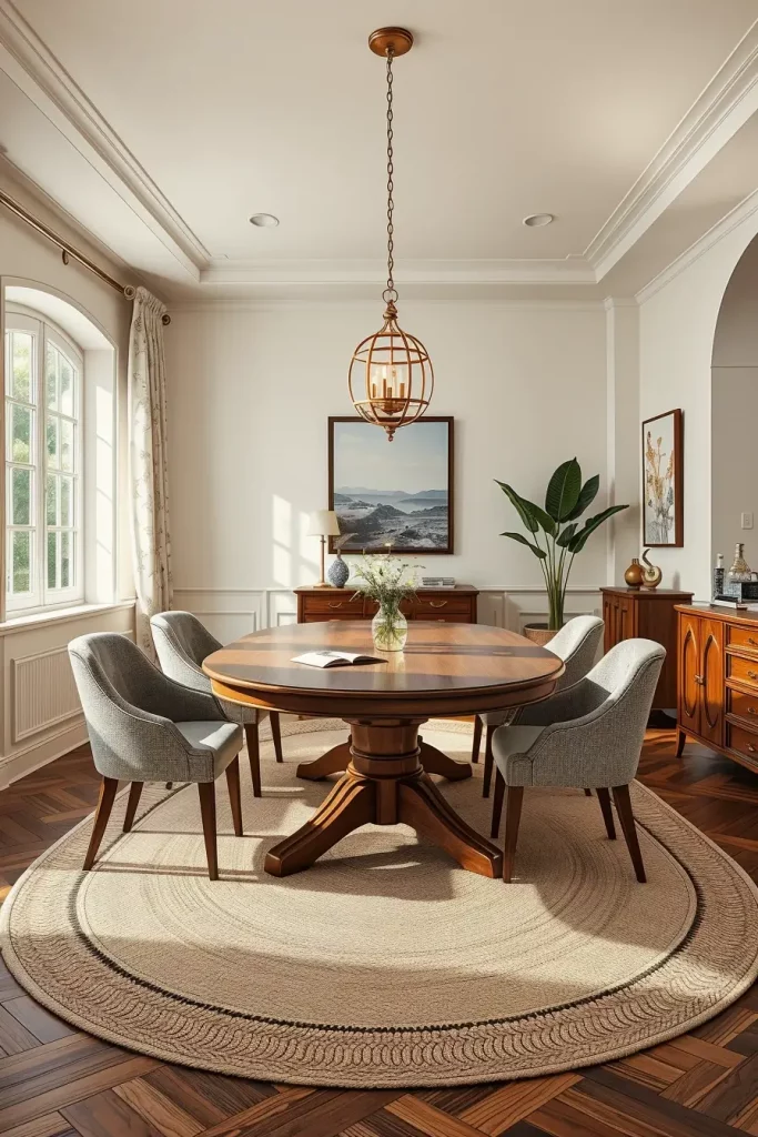 I tend to use a wooden oval table and upholstered chairs when styling to make it comfortable and add a textured rug under it to make the space. A chandelier or a modern pendant, an overhead statement light, gives significance to the table. Wooden cabinets or shelves in a matching color can unify the entire appearance so that the space does not seem random or disjointed.