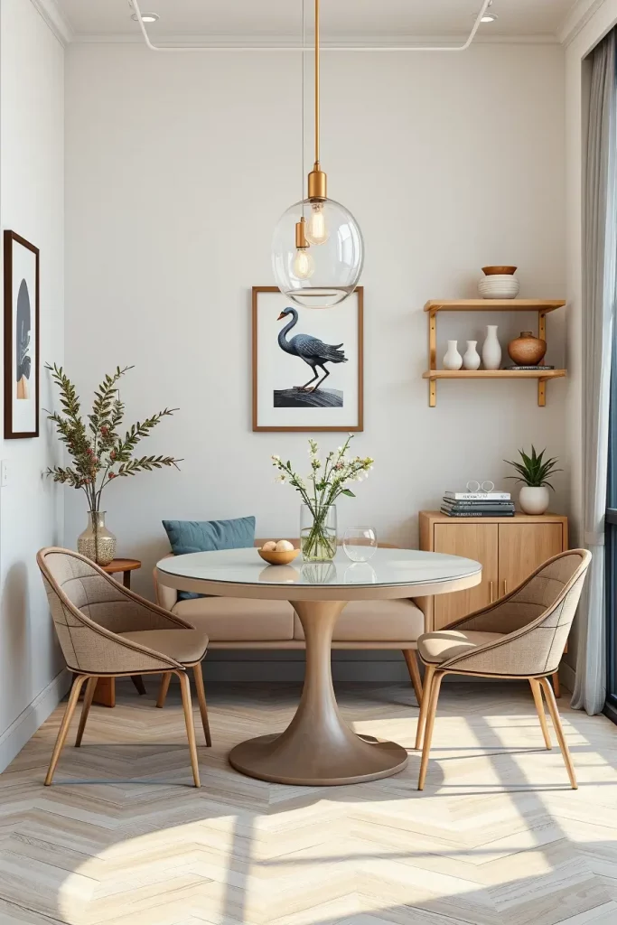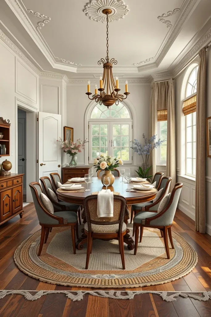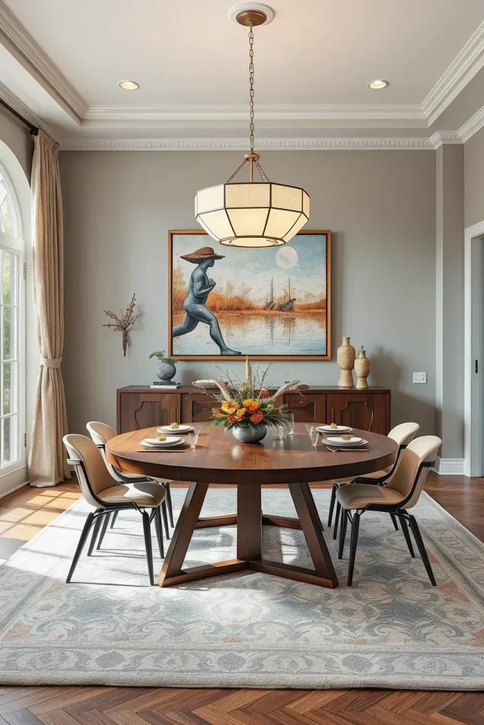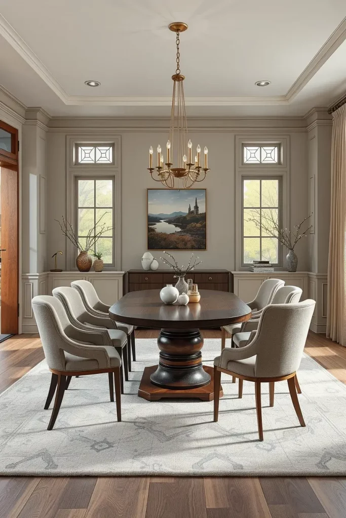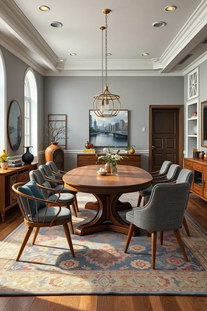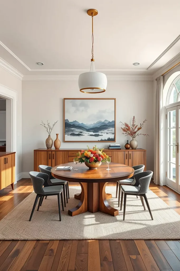 I tend to use a wooden oval table and upholstered chairs when styling to make it comfortable and add a textured rug under it to make the space. A chandelier or a modern pendant, an overhead statement light, gives significance to the table. Wooden cabinets or shelves in a matching color can unify the entire appearance so that the space does not seem random or disjointed.