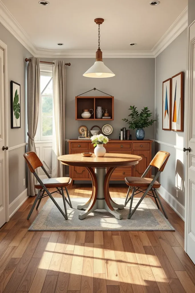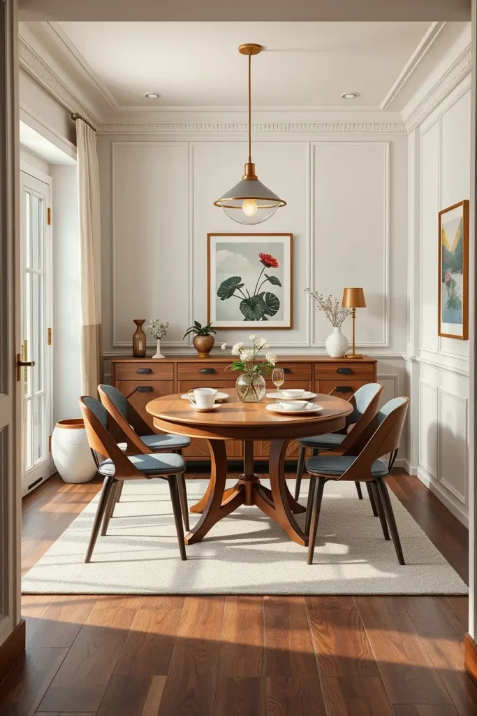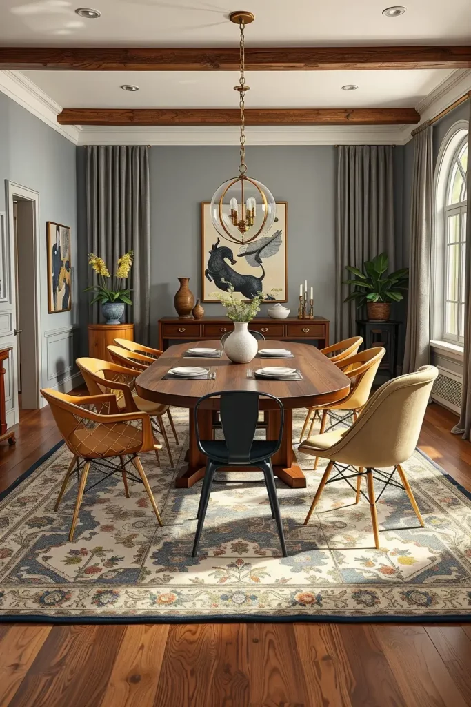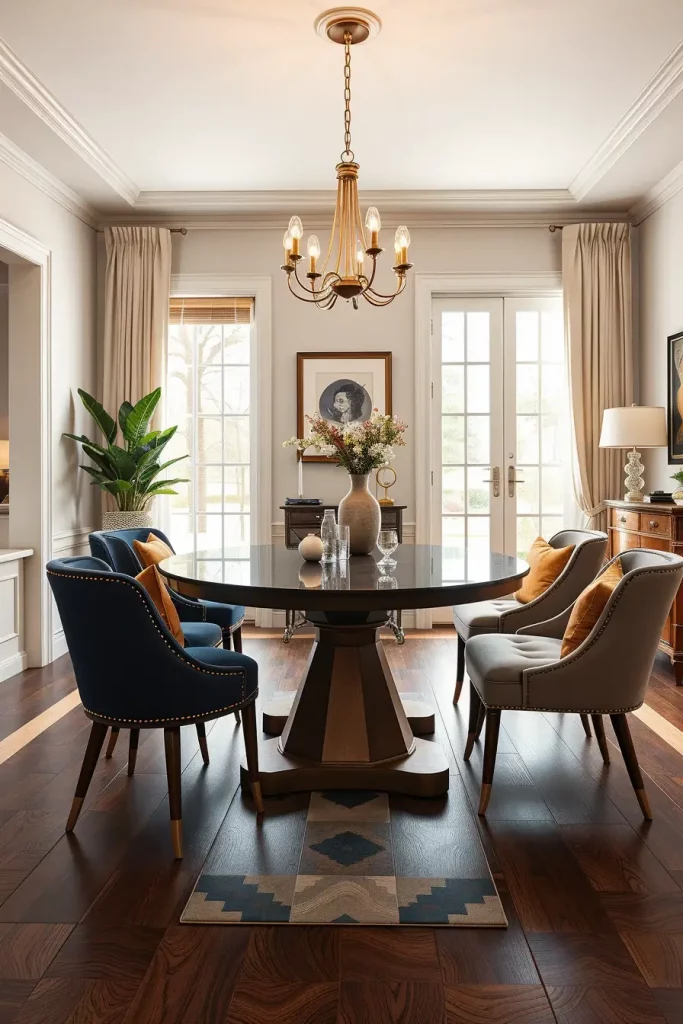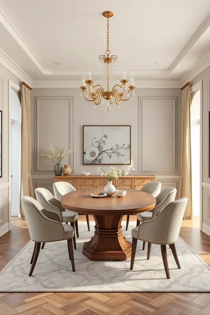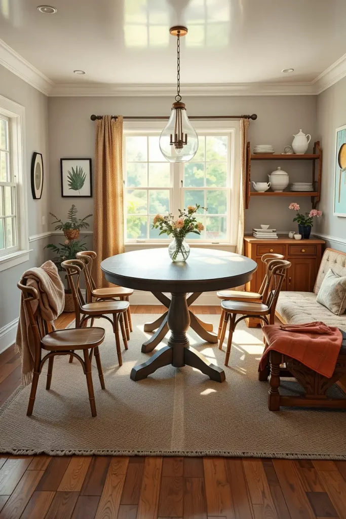 I tend to use a wooden oval table and upholstered chairs when styling to make it comfortable and add a textured rug under it to make the space. A chandelier or a modern pendant, an overhead statement light, gives significance to the table. Wooden cabinets or shelves in a matching color can unify the entire appearance so that the space does not seem random or disjointed.