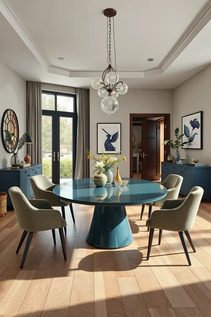 Clients who desire to make their oval dining table a showstopper usually receive my recommendation of using bold colors. A modern table in deep blue, forest green or even a dull red can serve as a statement piece but can also work well within the dining room.