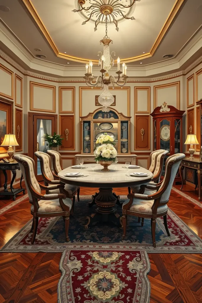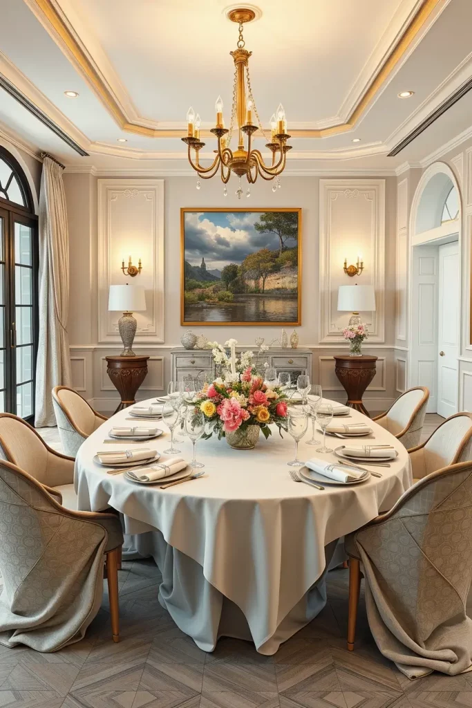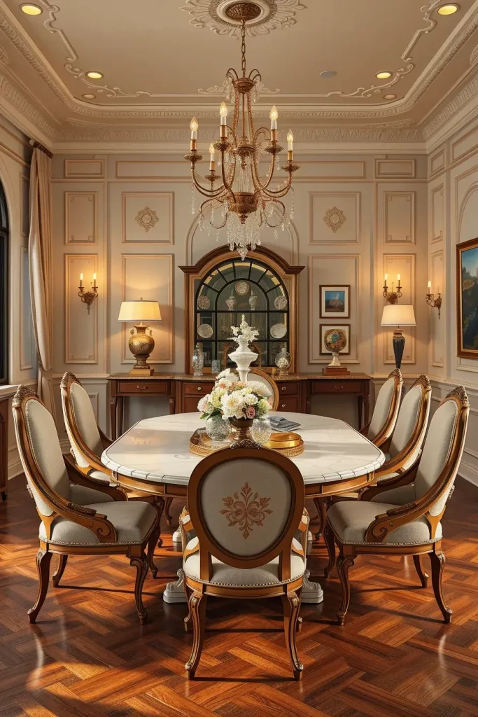 I would use such materials as rich hardwoods or marble on the table surface with upholstered chairs in fine fabrics. The formality is supported by the supporting elements such as the wall paneling, statement chandeliers, and fine china displays.