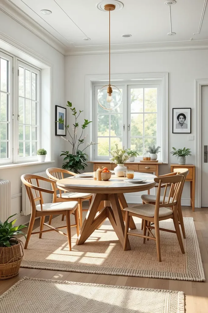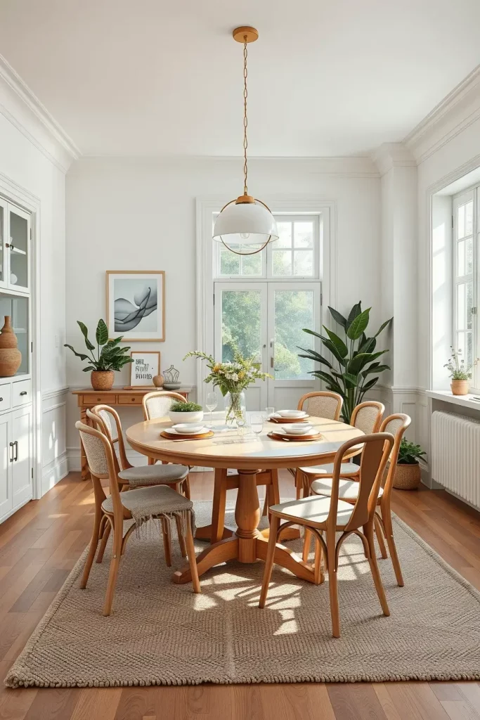 In furniture, I usually choose light-coloured woods such as ash or birch, with plain chairs in natural materials. There is a small pendant light, maybe matte white or brass, that does not overwhelm the room. The color scheme remains light, whites, beiges, and dull grays prevail on the scene, and tiny accents of greenery make the room lively.