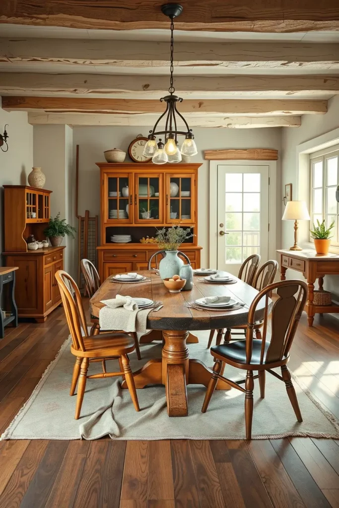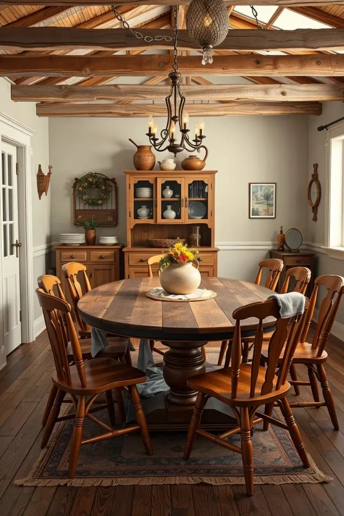 I prefer to use such tables with mismatched wooden chairs, vintage-looking lighting, and linen tablecloths in my designs. There could also be open shelving or a farmhouse style hutch to show off ceramics and glassware. This style accepts flaws and this makes it more realistic and endearing.