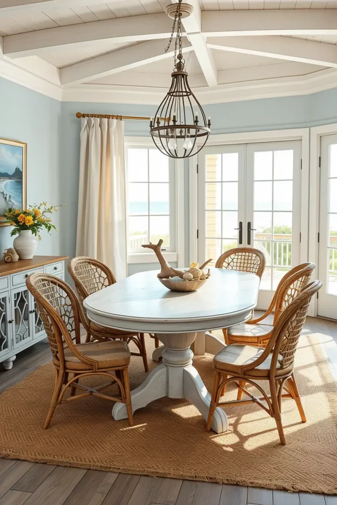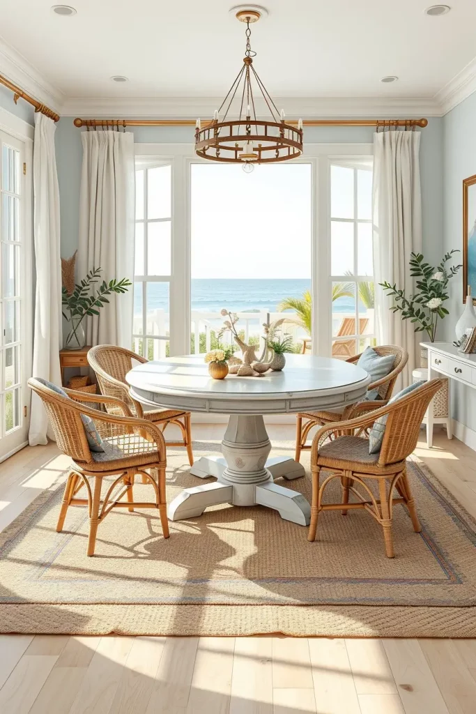 I like whitewashed or light oak tables and woven rattan or slipcovered chairs. The decorations could be seashells, driftwood decorations in the center of the room, and light linen curtains to allow the sunlight to enter the room. The coastal palette is brought together by soft blue and sandy beige colors.