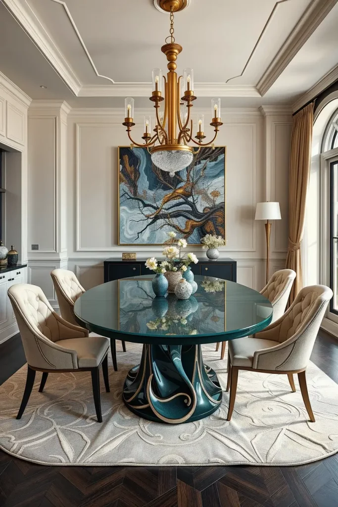 In this type of arrangement, I would combine the table with upholstered dining chairs in neutral color, a statement chandelier hanging above, and a soft area rug to ground the area. The room can be framed by sideboards or low cabinets made of complementary materials, which will not dominate the room. The design must be complete yet not cluttered so that the table is the centerpiece.