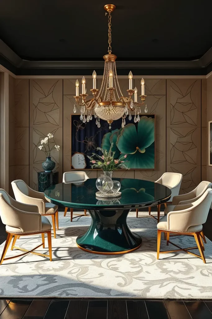 I usually suggest glossy lacquer, dark marble or bright color such as deep emerald or navy to use on the tabletop. To make it even more effective, it can be combined with the contrasting chairs, either in a lighter color or with the different texture. Lighting is also important here, and statement chandeliers or art-inspired modern lighting contribute to the drama.