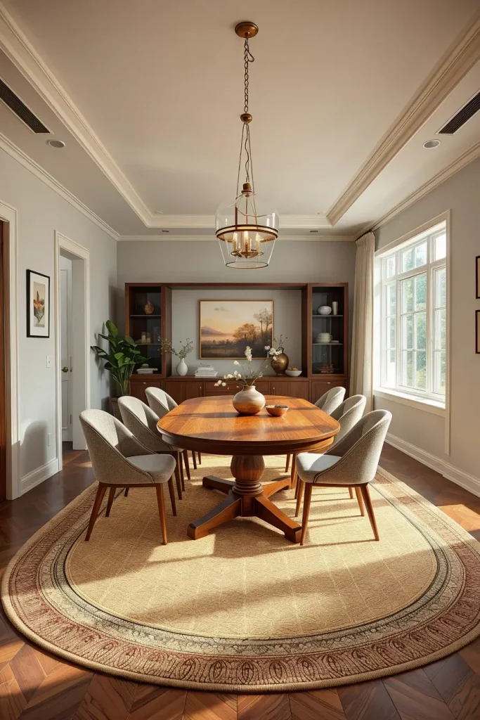 My advice is normally to use oval or round rugs, which are big enough to fit both the table and chairs, even when they are pulled out. It is all about material- flatweave rugs are easy to clean, and wool blends are soft and warm. The color and pattern must either match the finish of the table or be slightly contrasted.