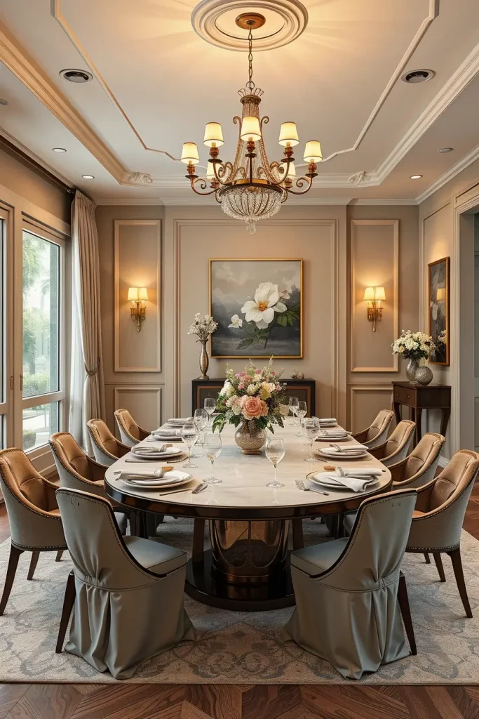 When decorating around an oval dining table, balance and proportion should be considered. Since the shape of the table is not as hard as a rectangle, the decor around it should not overpower it. I discover that wall art, sideboards, and well-selected centerpieces can be used to form a complete dining space.