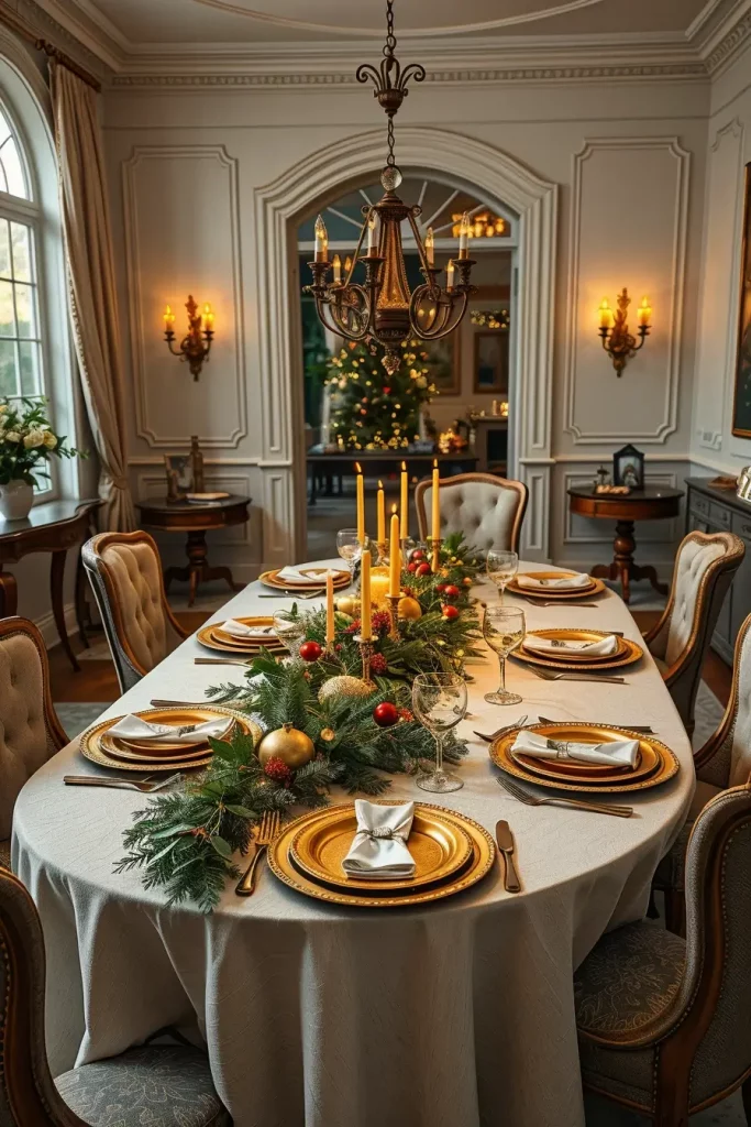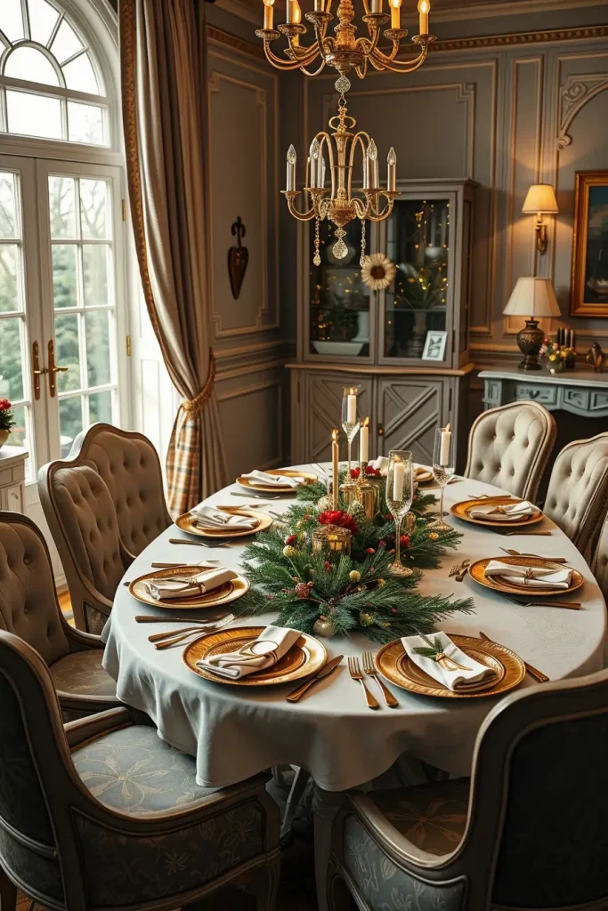 During holidays, an oval dining table is the best to use because it makes everyone feel part of the discussion. The rounded corners do away with the head of the table effect, promoting a less formal socializing. I prefer to incorporate a festive element in the decor of a dining room to add to the general atmosphere of celebration but maintain the unity of the design of the table.