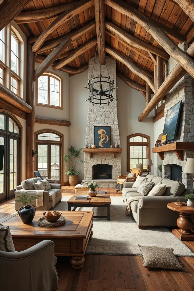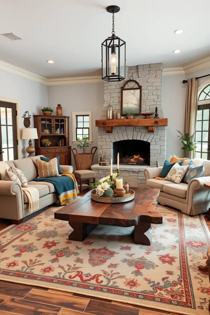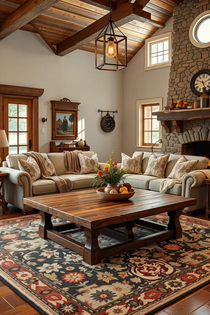 I tend to suggest a neutral sofa with some cozy throws, a coffee table made of reclaimed wood, and a large area rug with minor patterns. A fireplace, where possible, is the centre of attention, particularly when combined with stone or brick.