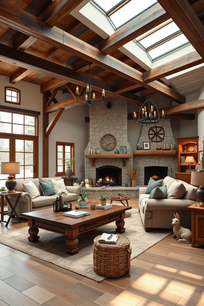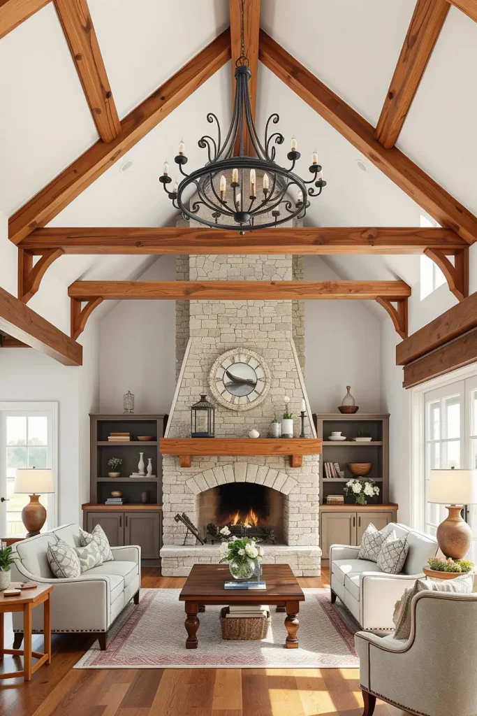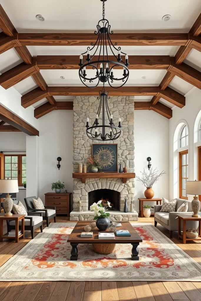 In rooms I have been in, white-painted walls and stone fireplaces go well with the exposed beams. They also provide the opportunity to be creative with lighting- a wrought-iron chandelier or pendant fixtures between beams.