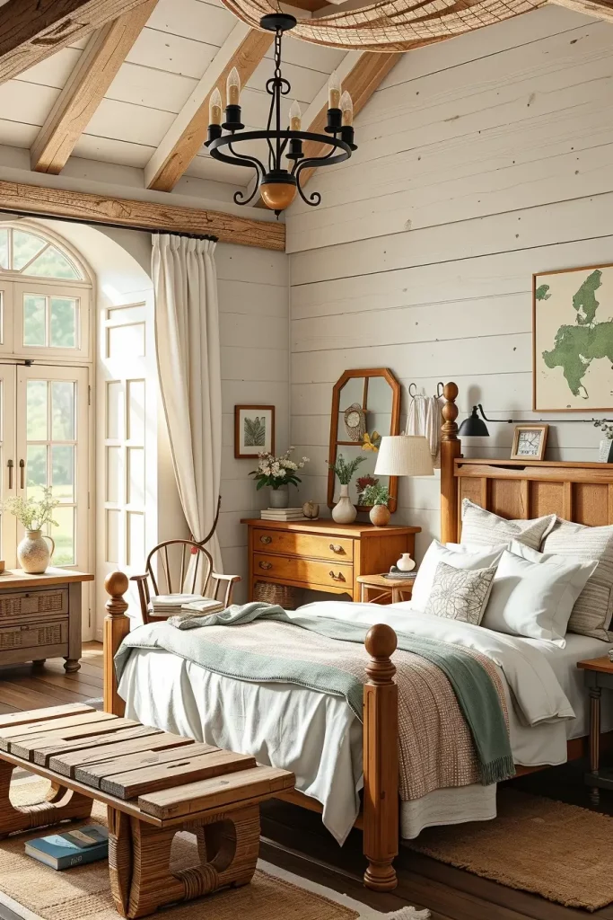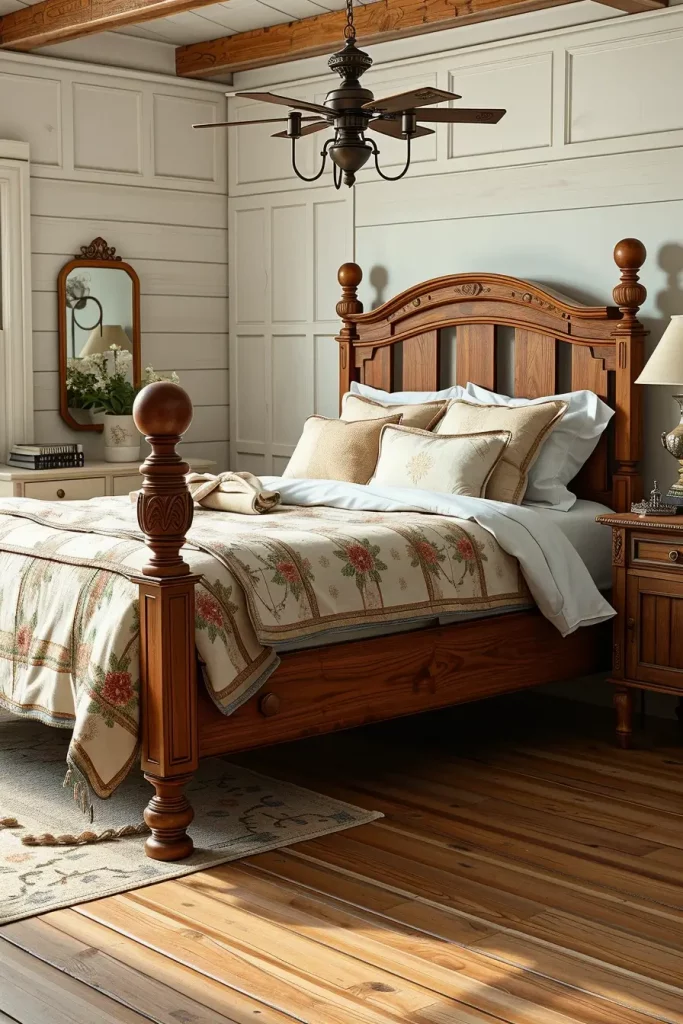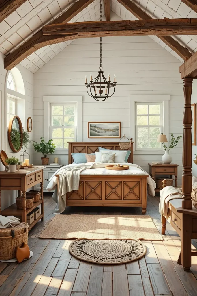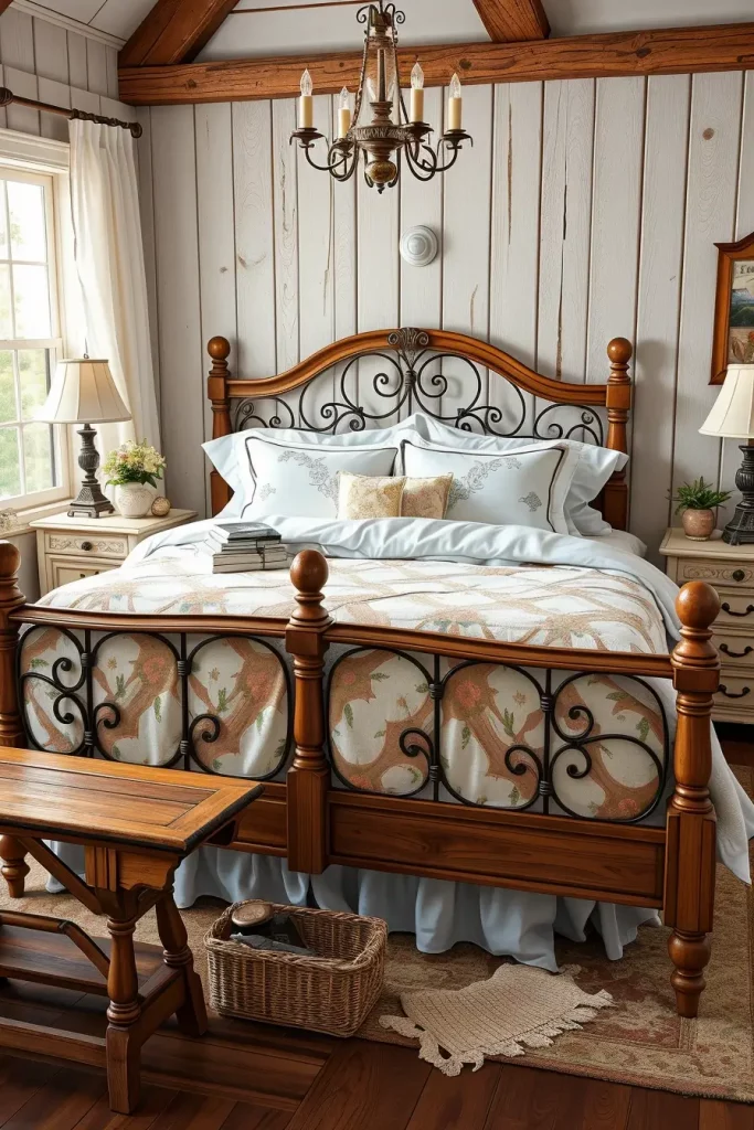 I tend to use wooden bed frames, plain bedding in cotton or linen, and antique nightstands. Wrought-iron bed frames are also a nice touch, and layered quilts on the bed reinforce the farmhouse style.