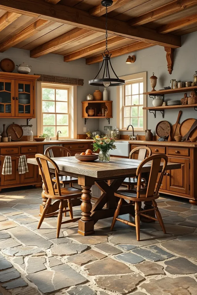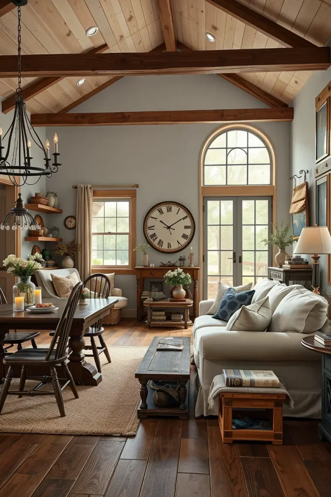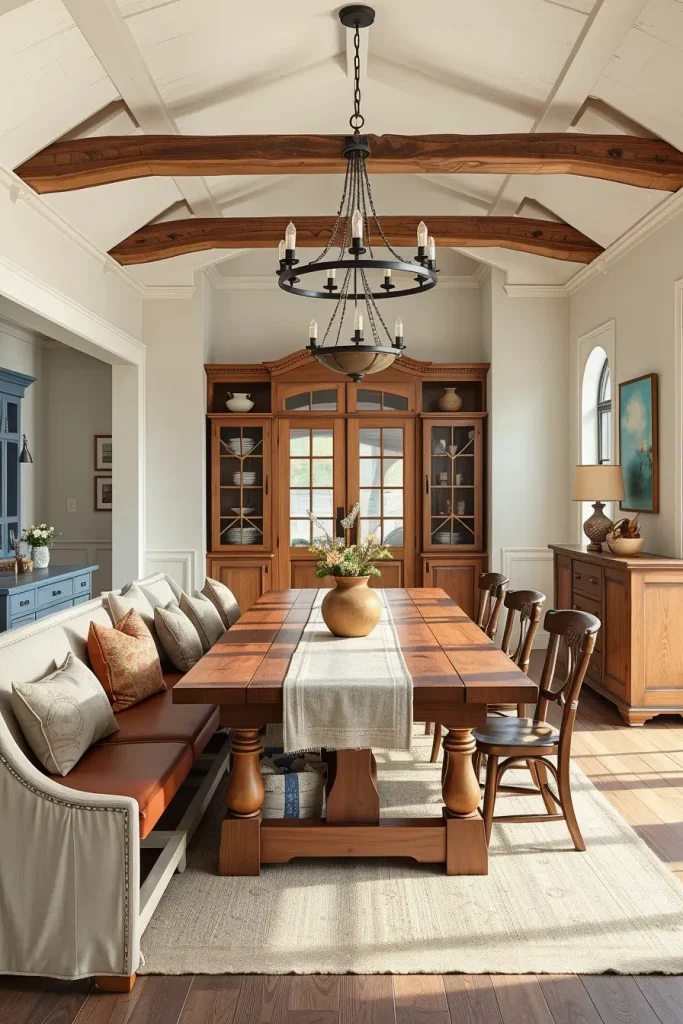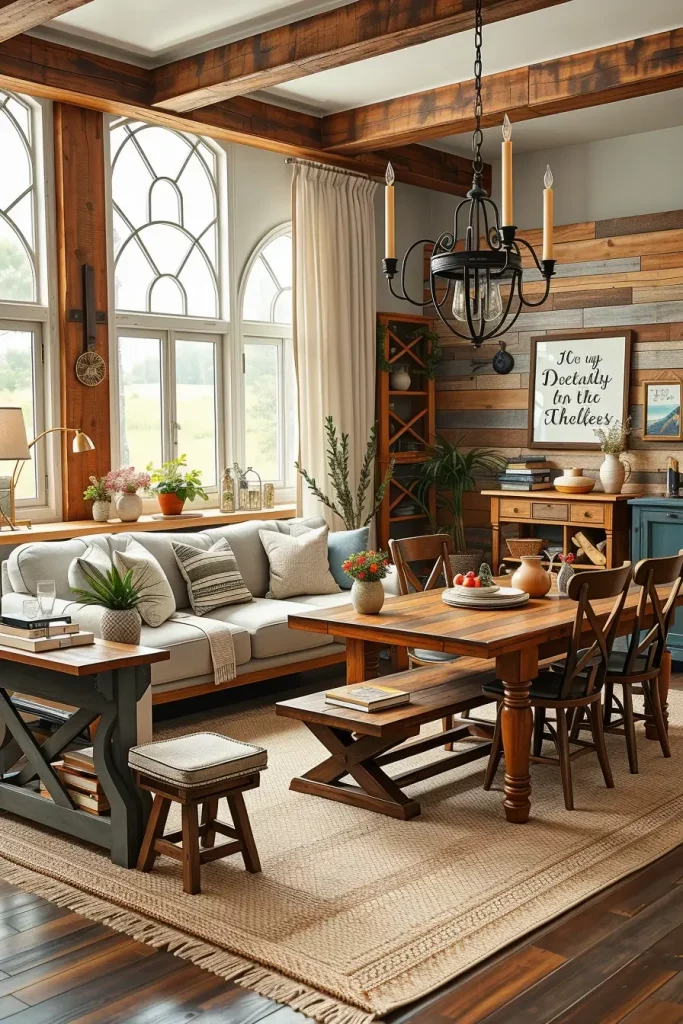 I would also recommend using multifunctional furniture, such as storage benches or vintage-finished cabinets. Such additions are a balance of beauty and utility that is the core of the rustic farmhouse style.
