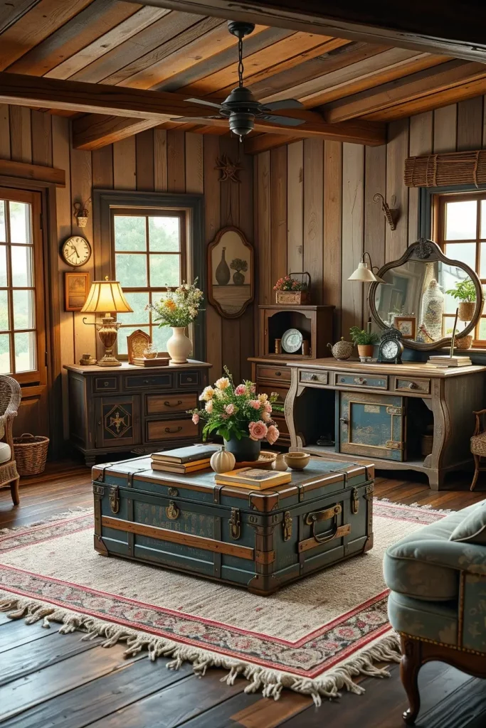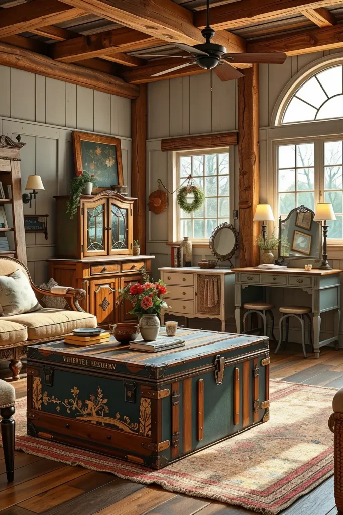 In farmhouse style, I have repurposed old chests as coffee tables, old dressers as bathroom vanities and old trunks as storage. These re-purposed items bring in more history and yet they blend in perfectly with contemporary homes.