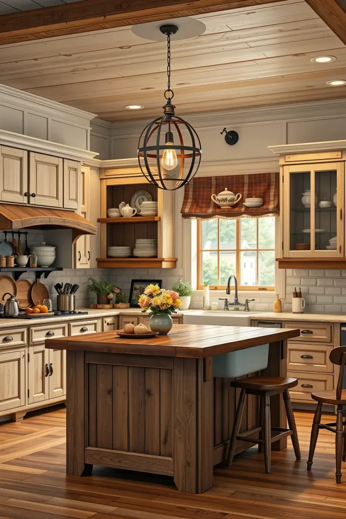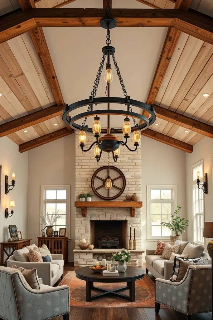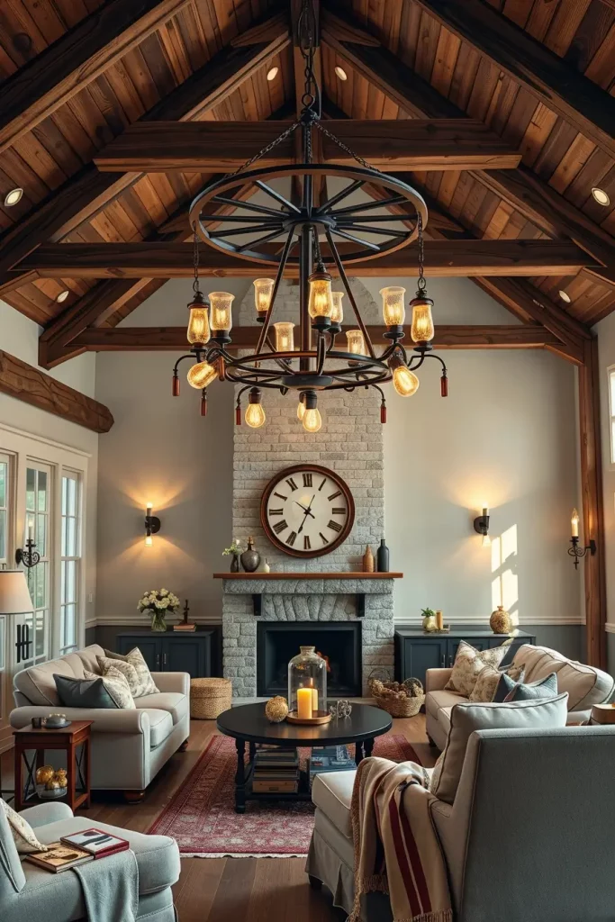 Lighting can be used to create the farmhouse look and I never neglect it as a secondary element. In a cozy farmhouse house, the appropriate lighting device will be a combination of functionality and rustic style-wrought iron chandeliers, pendant lamps with glass shades, or wall sconces with a distressed finish. These are not only sources of light, they create an atmosphere.