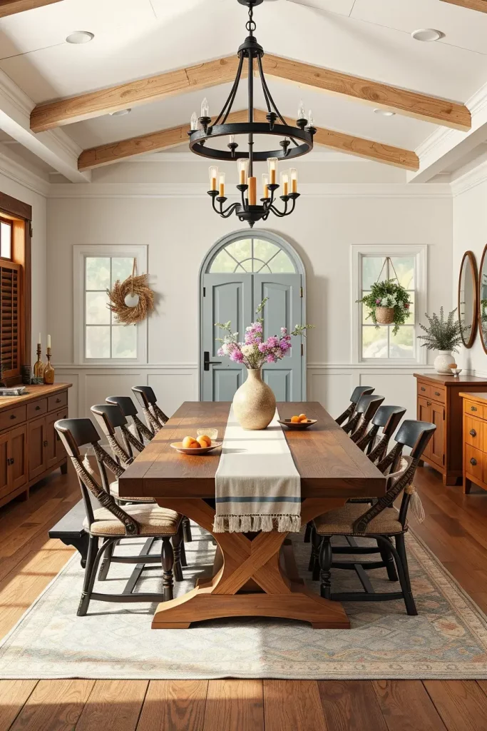 I think that less decoration is better to show the furniture. House Beautiful often notes that the best farmhouse dining rooms are those that are kept uncluttered, so that the table is the focus. A simple centerpiece such as a ceramic vase with seasonal flowers is also beautiful.