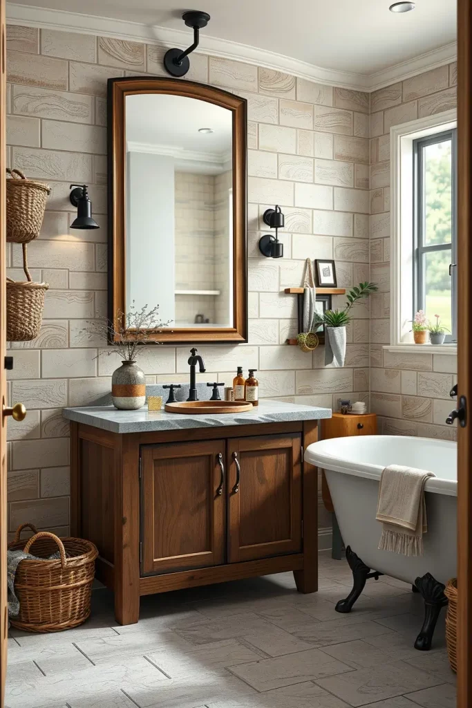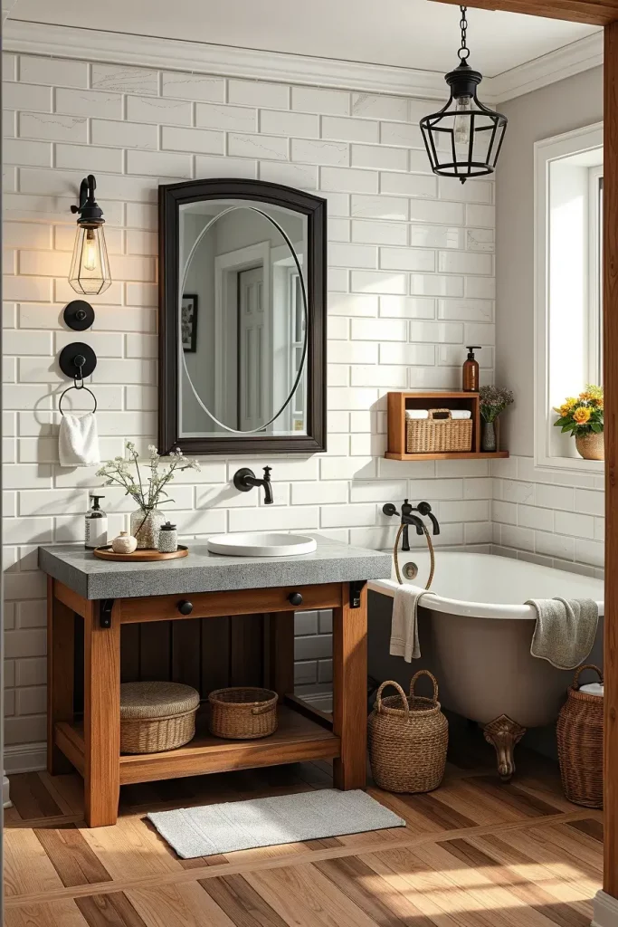 In my projects, I have incorporated wood vanities and stone countertops, subway tile walls, and vintage-style mirrors. Clawfoot tubs or apron-front sinks are a farmhouse touch that keeps the room classic.