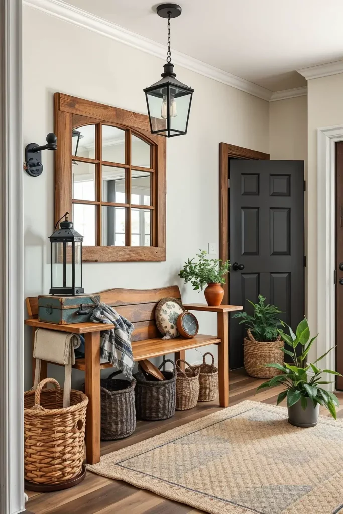 The first impression that I am after, when I am designing a farmhouse entryway, is a warm one. The entryway will establish the mood of the entire house so the reclaimed wood benches, weathered hooks to hang coats, and woven baskets to store items will make it practical yet beautiful. A carefully designed entrance area with rustic furnishings does not only provide functionality but also brings in the natural materials that are the key to farmhouse style.
