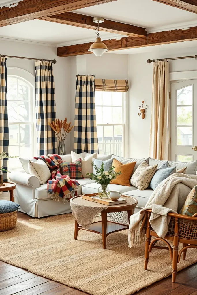 The farmhouse style is one of the most pleasant things about seasonal decor. I enjoy changing with each season with small but important accents. In autumn, pumpkins, plaid blankets, and warm-colored wreaths are the rule, whereas in winter, evergreens, candles, and rustic garlands are the order of the day. Spring brings in florals, summer brings in light linens and fresh greenery.