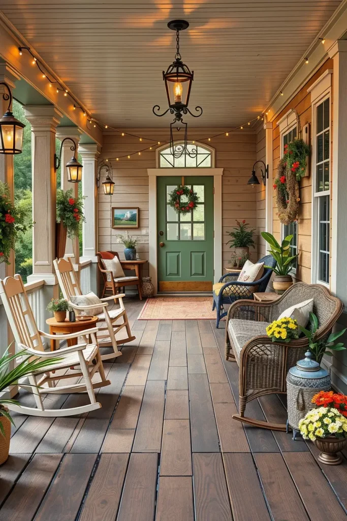 As far as furniture goes, I usually pick wicker or wooden rocking chairs, a porch swing with cushions, and a sturdy farmhouse table to gather around. The accessories such as lanterns, string lights, and potted plants add a touch of class and give a welcoming impression. A painted front door, usually in a darker color such as sage green or deep blue, is a character feature that balances with the natural environment.