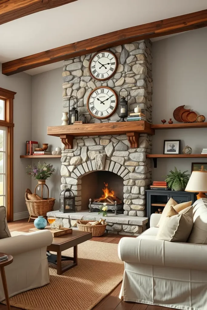 I would use chunky reclaimed beams or distressed wood shelves as mantels. Dressing them with lanterns, old clocks, piled books and framed family photos make the display personal and warm. A stone or brick surround of the fireplace further adds to the rustic effect.