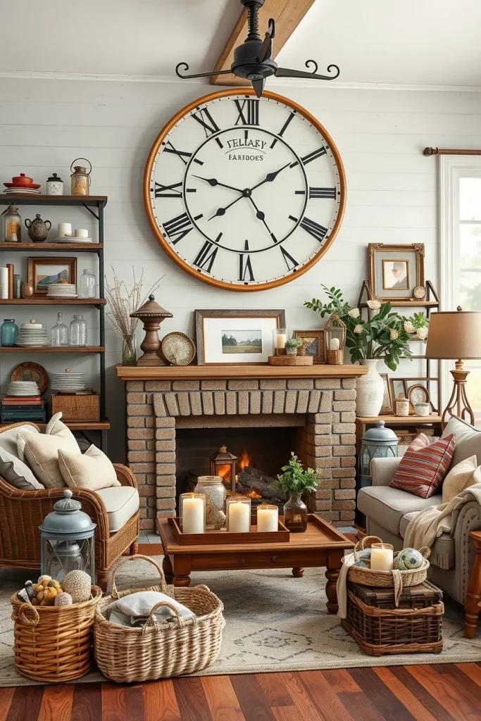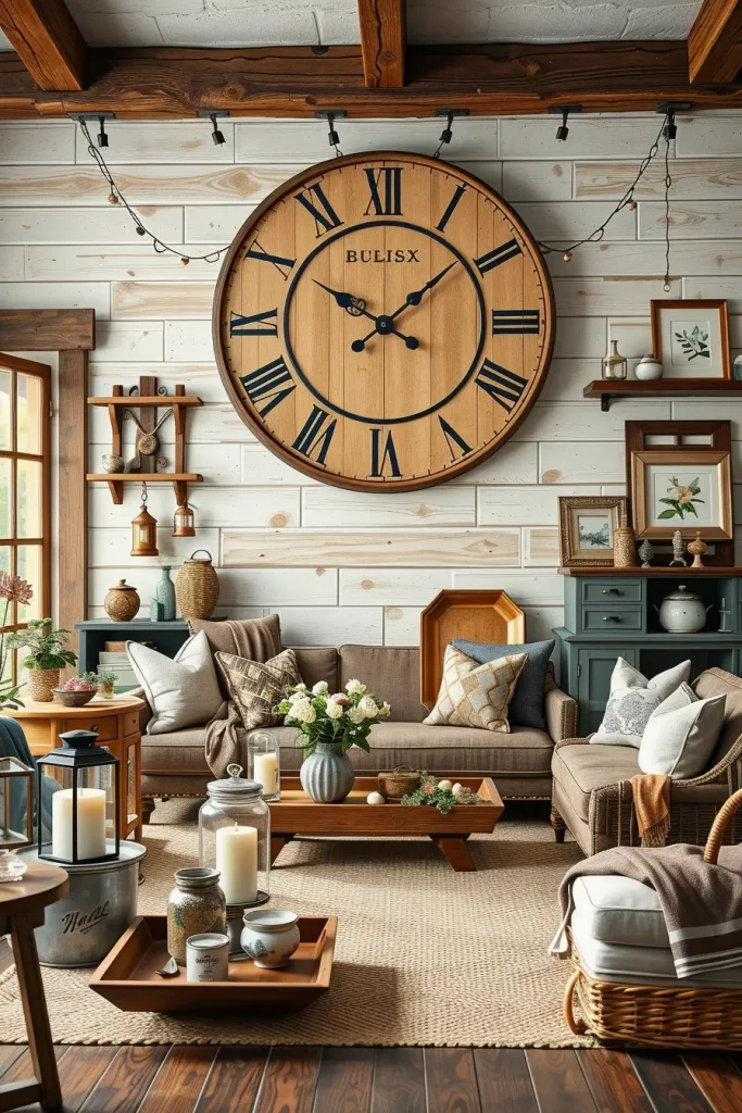 I tend to use wall clocks with large faces, distressed picture frames and candle lanterns. In eating places, enamelware and vintage dishware can be used as decor. All accents must be connected to the natural textures and dull color schemes, so that the space is harmonious.