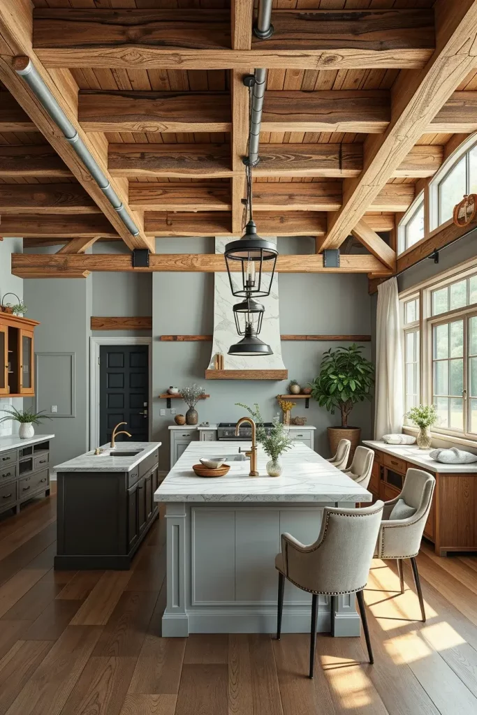 I always incorporate staple items like reclaimed wood dining tables, linen upholstered chairs, and a farmhouse sink in the kitchen. However, I would also consider adding industrial-style pendant lights, minimalist shelving, or a marble countertop to bring a sense of sophistication. This combination brings the rustic style to a new level of being new and modern in terms of interior design.
