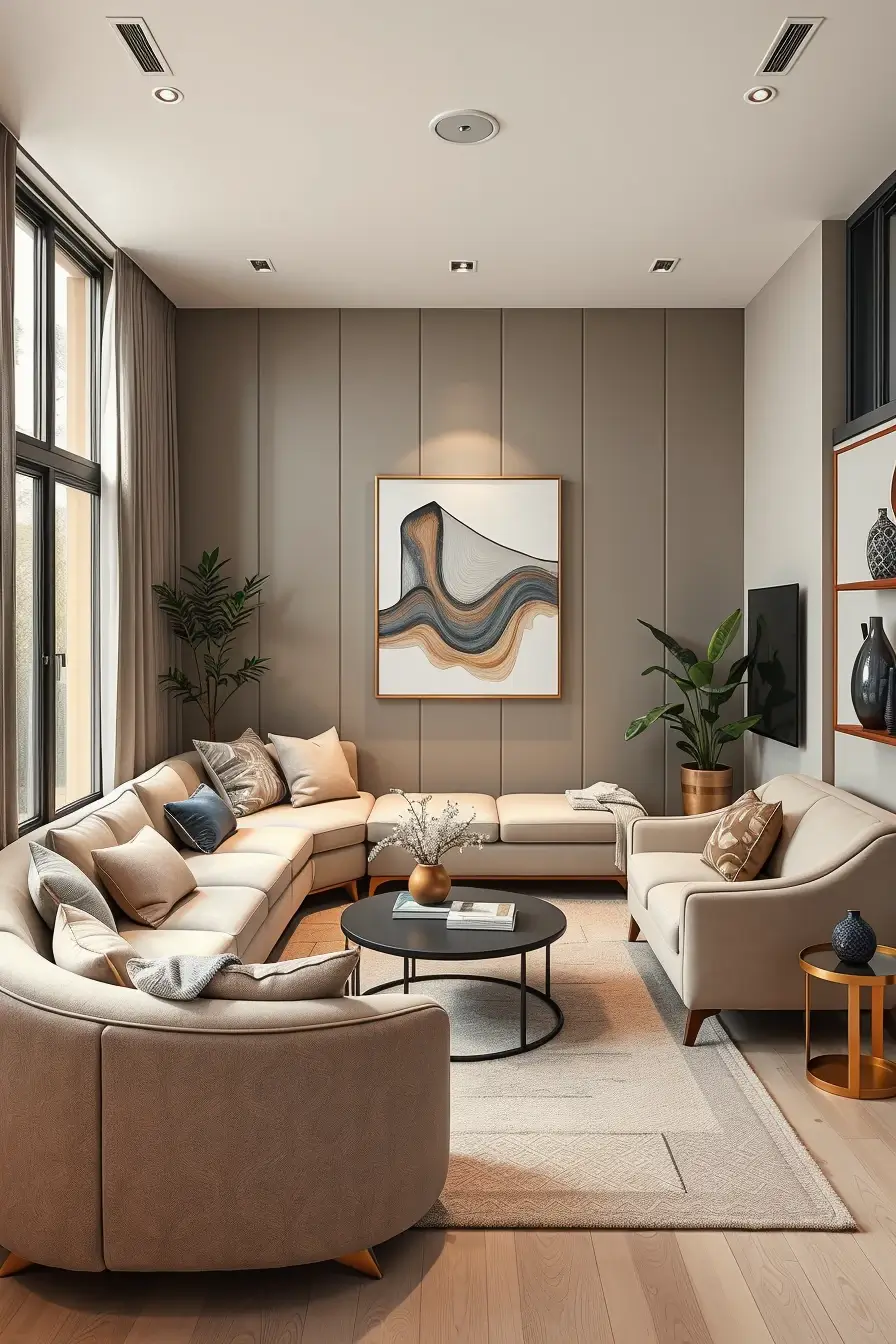 I have a tendency to start with a neutral base, soft gray or beige walls, and develop it. The plush fabric sofa with a curved shape, a knitted throw, and a smooth oval coffee table are bound to make one feel at home but at the same time luxurious. Layering is what makes an average room to look like a designer level retreat.