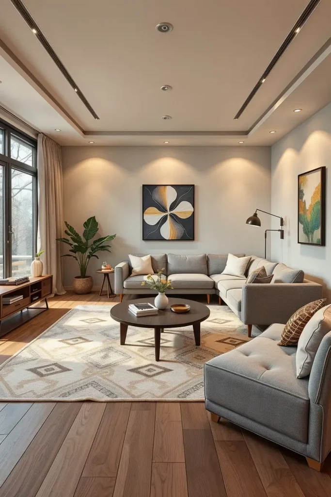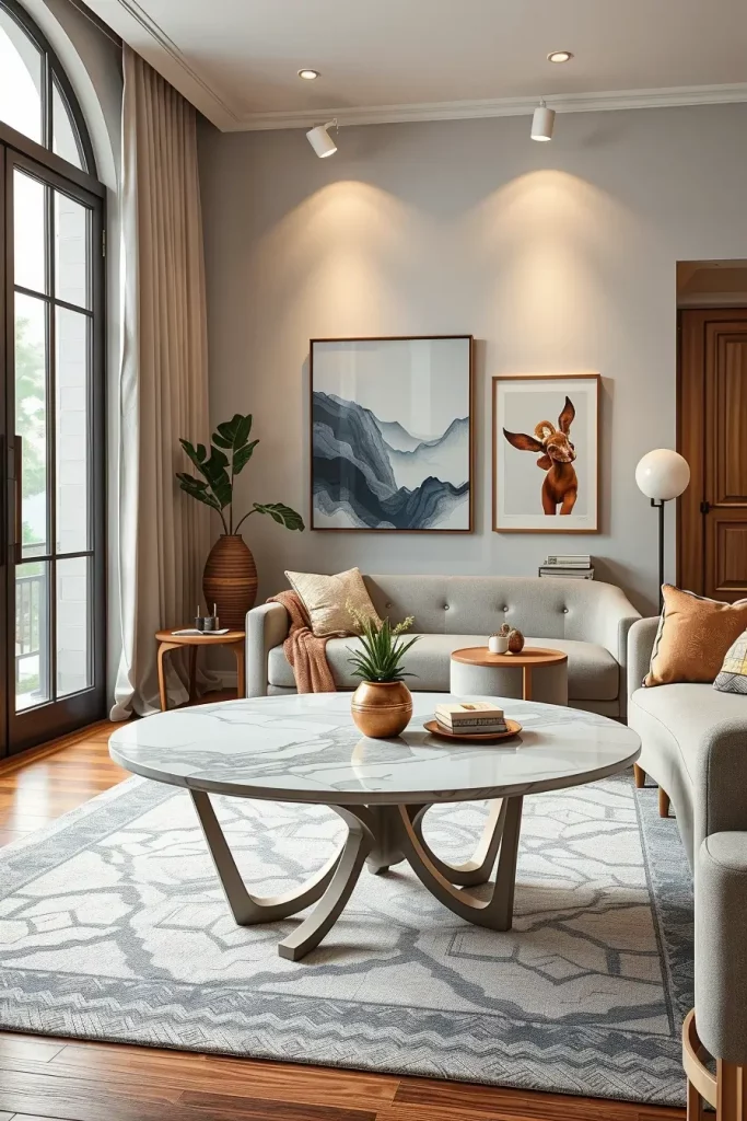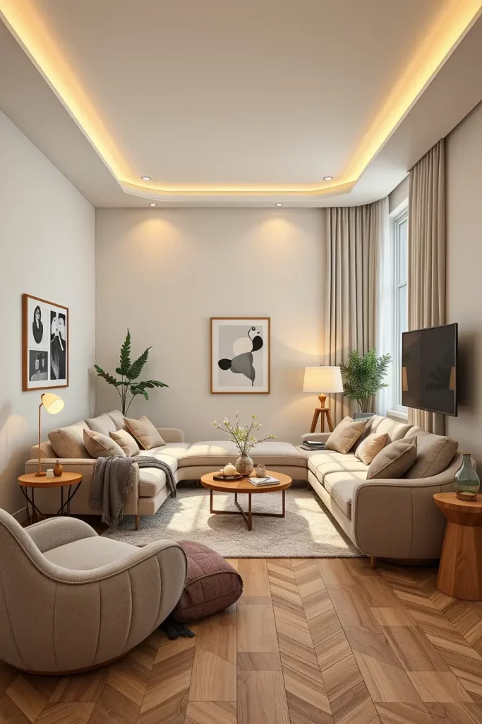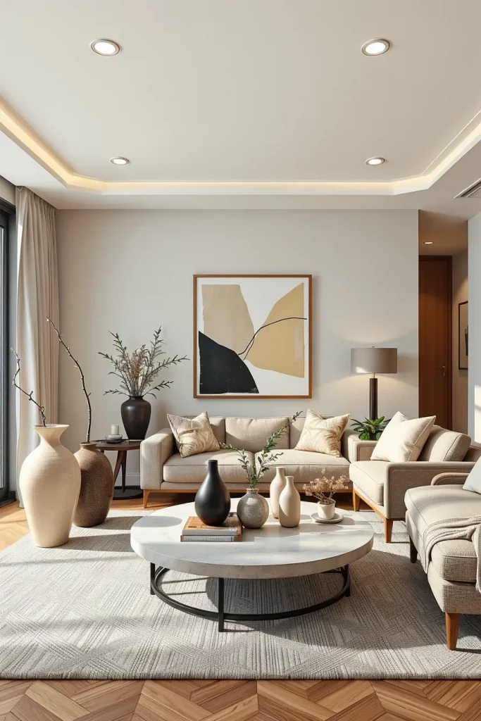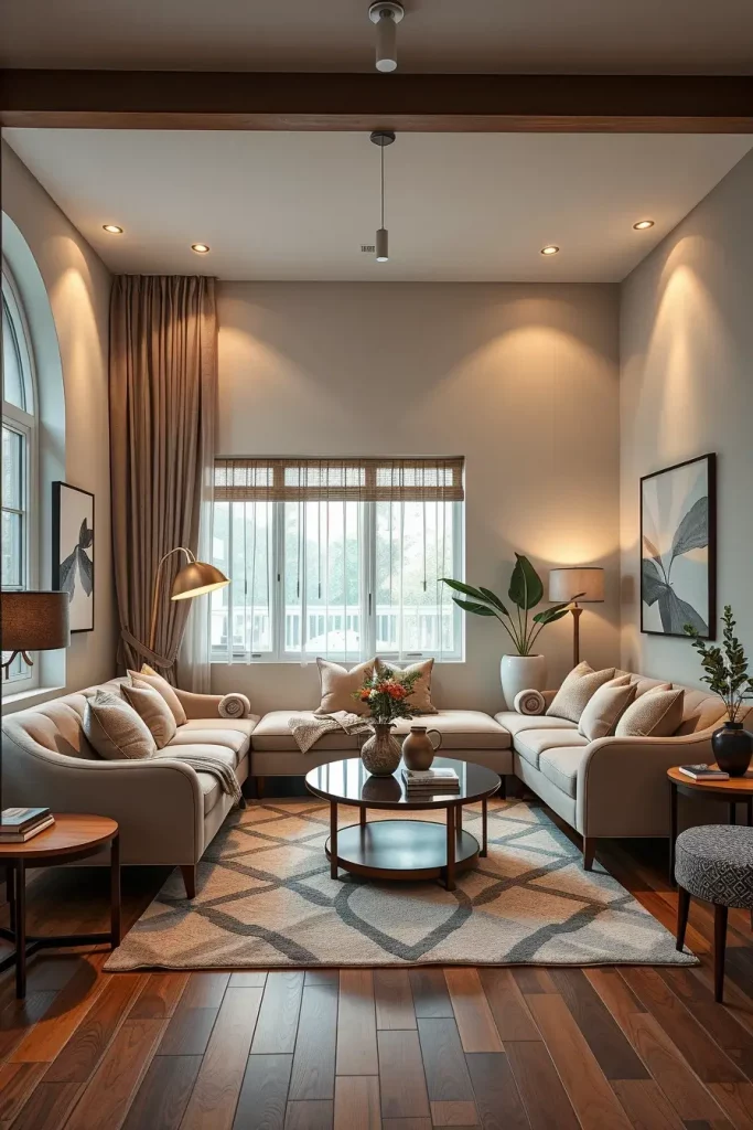 I have a tendency to start with a neutral base, soft gray or beige walls, and develop it. The plush fabric sofa with a curved shape, a knitted throw, and a smooth oval coffee table are bound to make one feel at home but at the same time luxurious. Layering is what makes an average room to look like a designer level retreat.