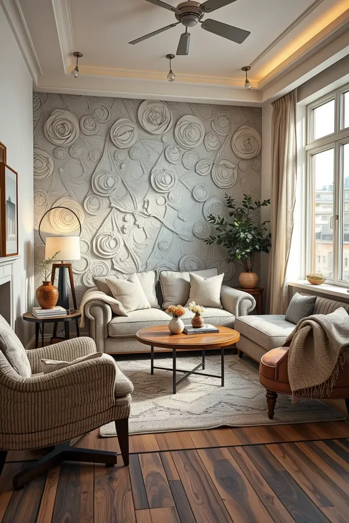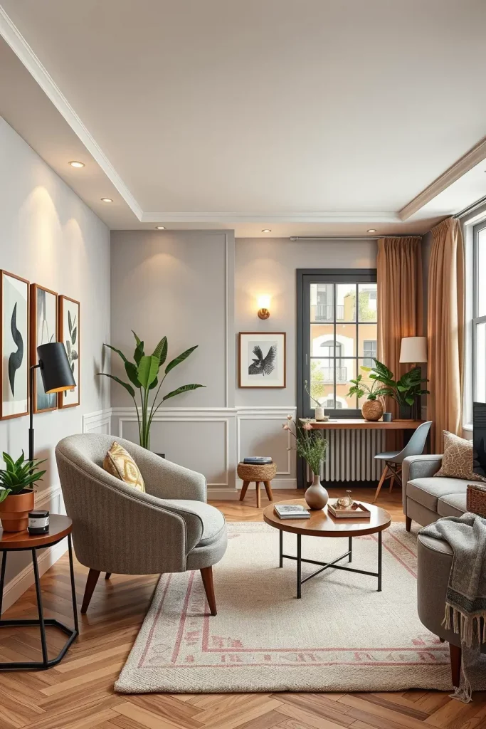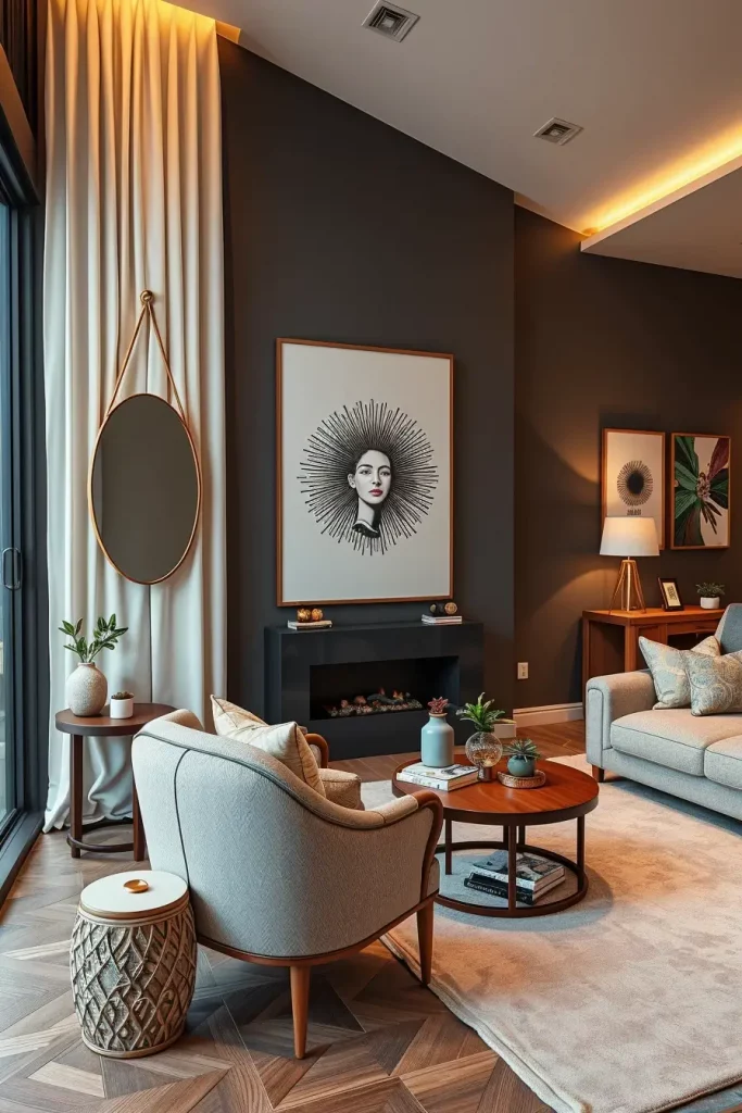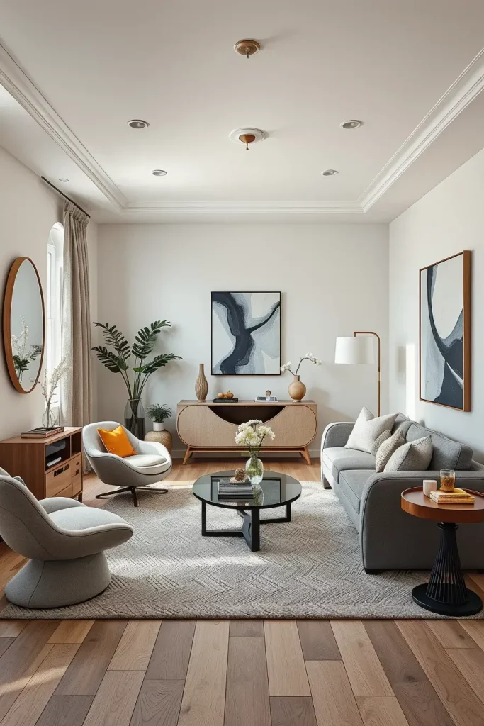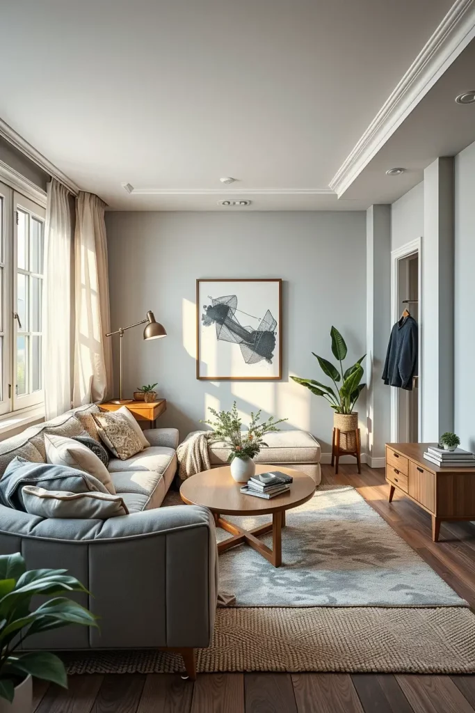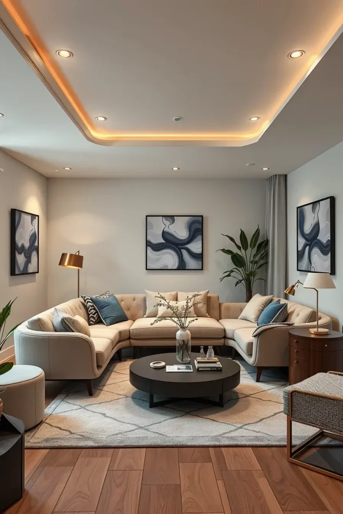 I have a tendency to start with a neutral base, soft gray or beige walls, and develop it. The plush fabric sofa with a curved shape, a knitted throw, and a smooth oval coffee table are bound to make one feel at home but at the same time luxurious. Layering is what makes an average room to look like a designer level retreat.