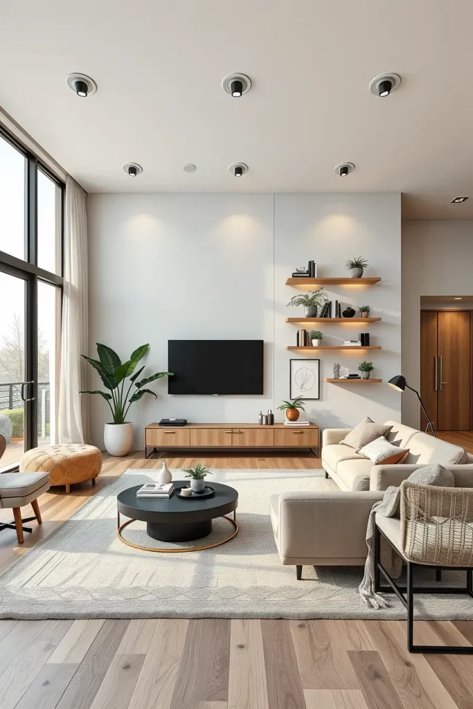 To this set-up, I would add in-built LED strips behind the shelves or the TV wall. It is a minor detail that radically improves the aesthetic and coziness of the space.