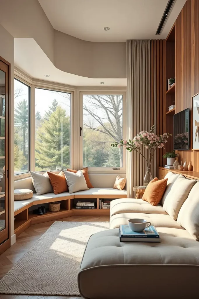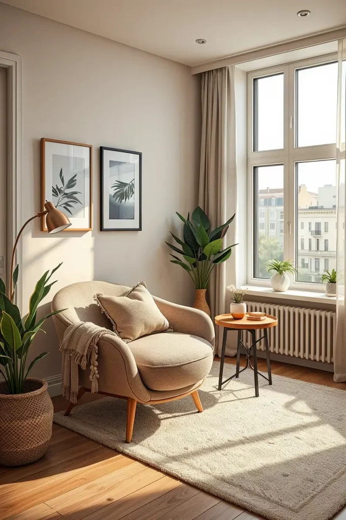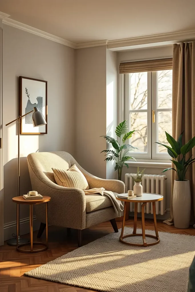 In this section, I would put in accent pillows in trendy colors, such as the color of sage green or terracotta, to provide a faint touch of coziness and act as a contrast to the rest of the designer furniture.