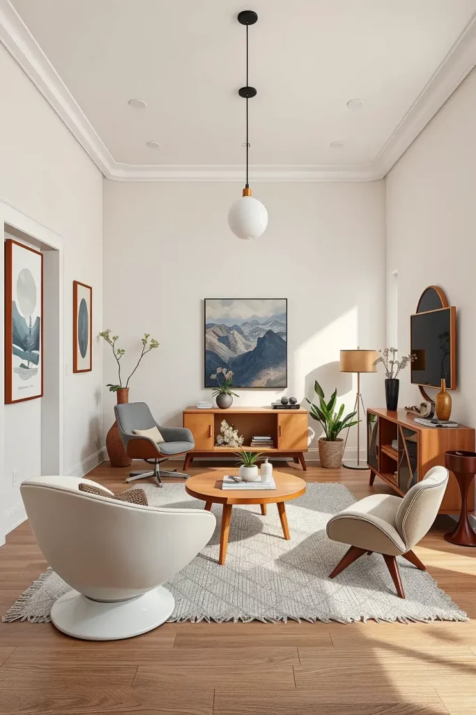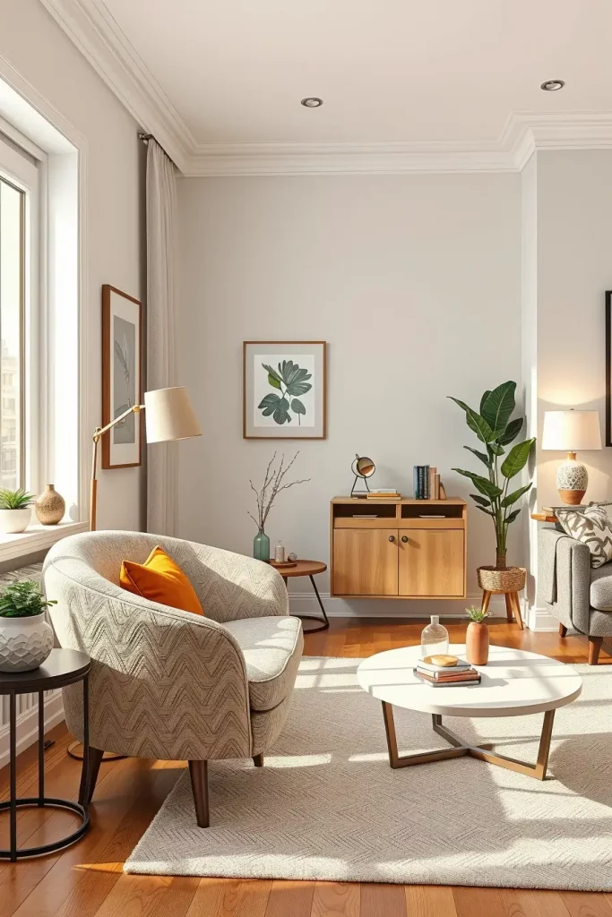 In decor curation, I choose accents furniture that will provide color and shape without being cluttered. An example of this is an oval dusty pink armchair, a set of round nesting tables, or a sculptural streamlined metal base floor lamp. I usually include minimalistic wall art with soft geometrical forms, which reflect curvature in the furniture and enhance the design unity.