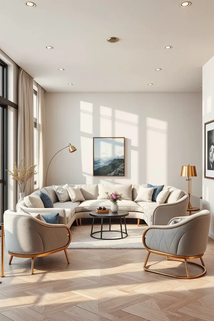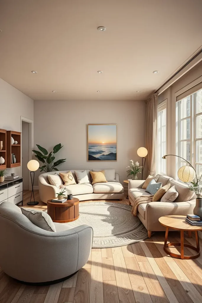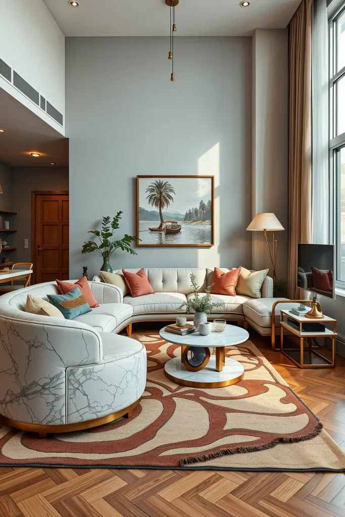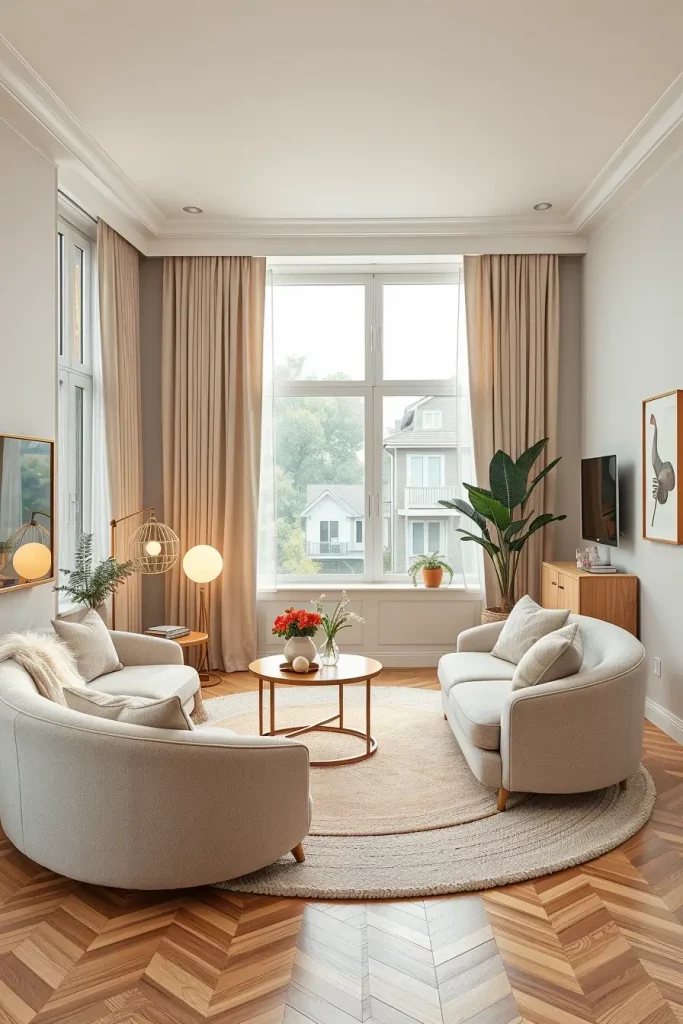 I usually choose designer furniture that effortlessly balances between structure and comfort, when designing with rounded forms. Rounded sectional, pebble coffee table and circular area rugs provide a visual rhythm and balance the room geometry. Even lamps are made according to this organic aesthetic- think arched floor lights, and globe lamps. All these details create a harmonious and fashionable apartment.