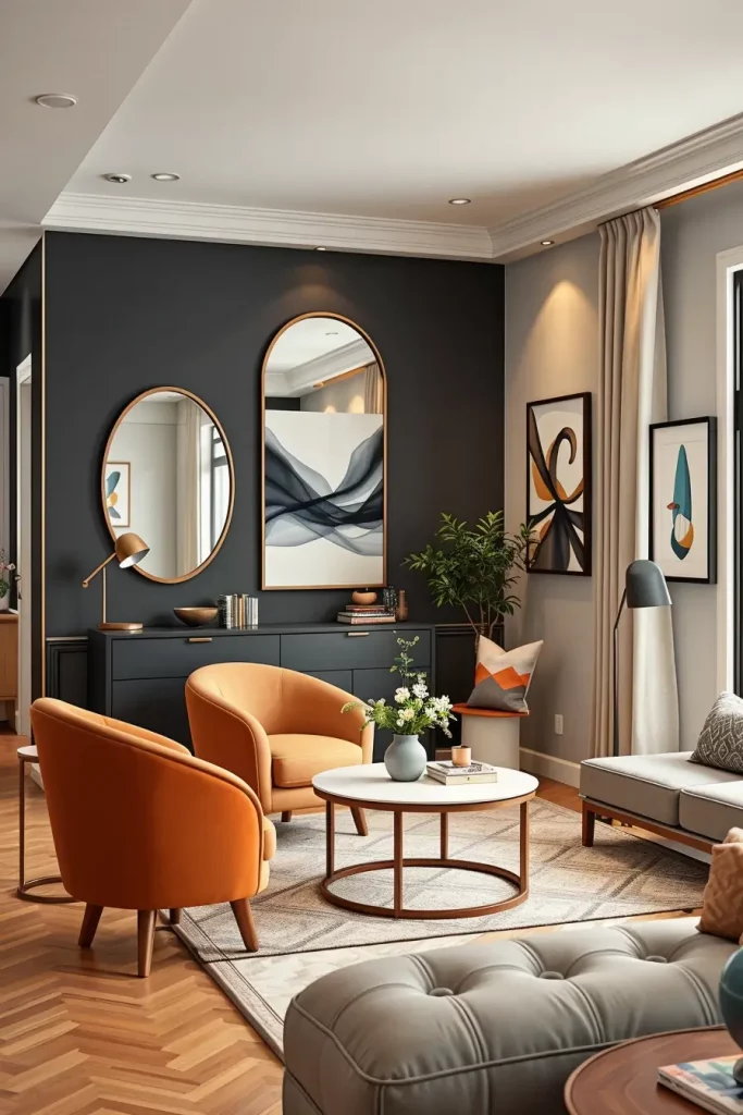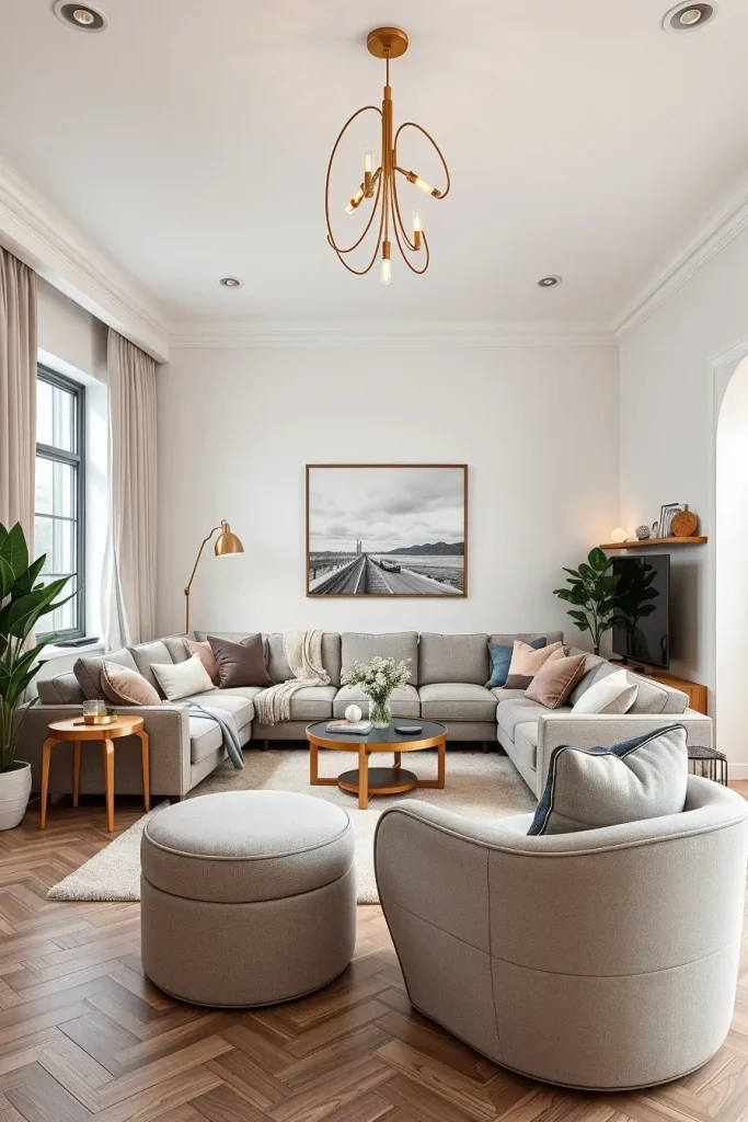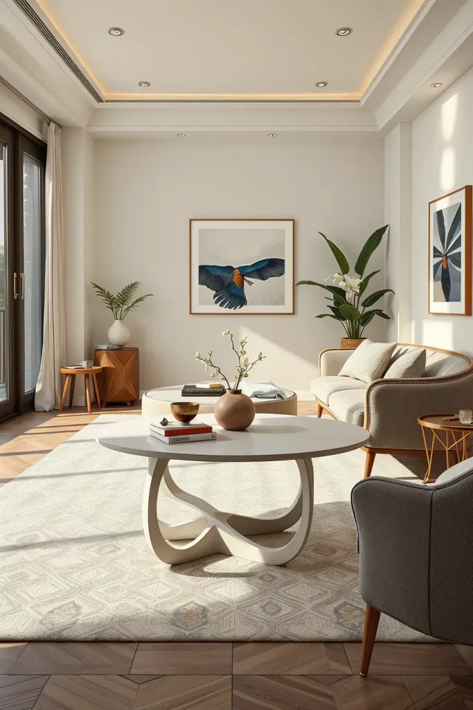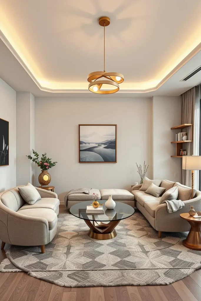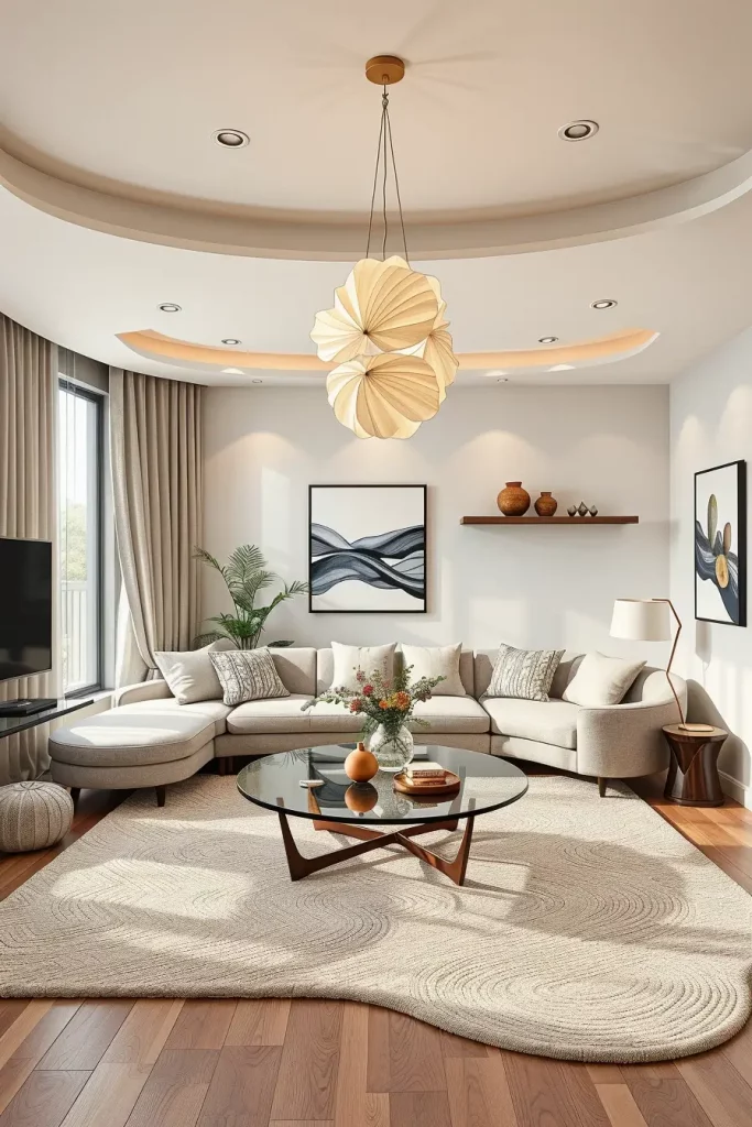 I usually choose designer furniture that effortlessly balances between structure and comfort, when designing with rounded forms. Rounded sectional, pebble coffee table and circular area rugs provide a visual rhythm and balance the room geometry. Even lamps are made according to this organic aesthetic- think arched floor lights, and globe lamps. All these details create a harmonious and fashionable apartment.