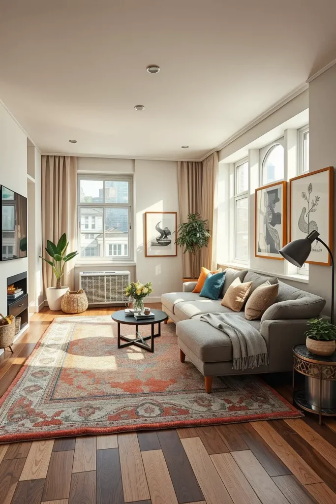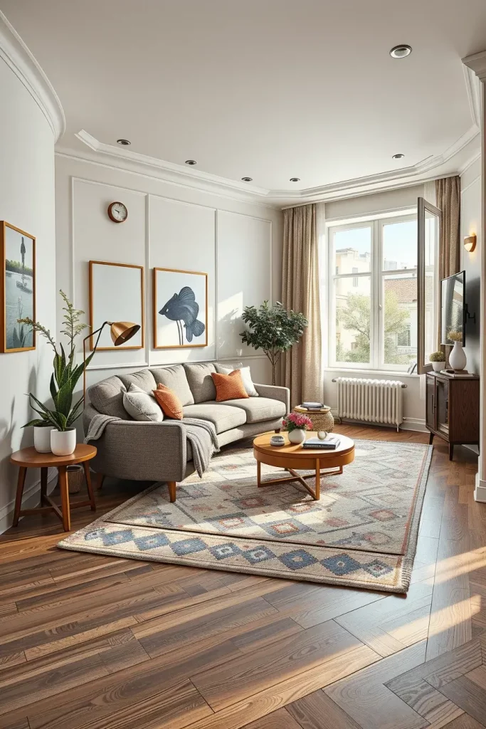 Rugs are important in the construction of tiny apartments living rooms. I always explain to the clients that even the most minimal layouts can be defined and provided with sense by a good rug choice. Statement rugs are also trending in 2026 with soft geometrical or textured finishes- it adds personality to the design but keeps the design grounded.
