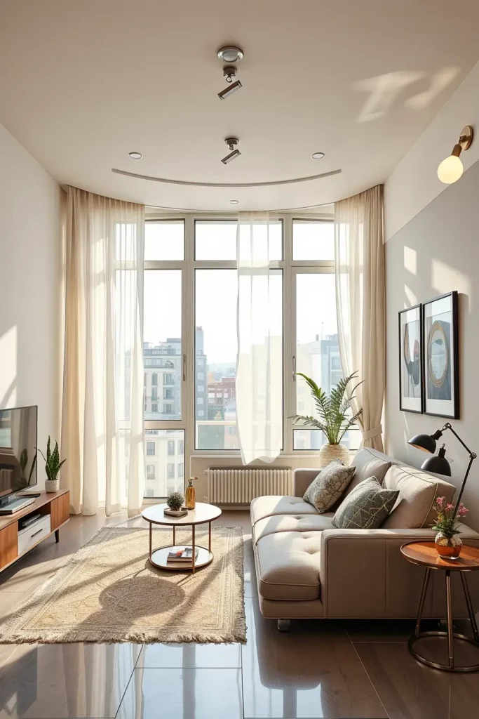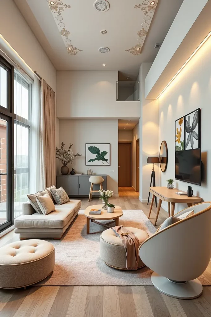 To balance this would be soft throws, rounded side tables and sculptural lighting. Such objects are elegant and simultaneously support the impression of the flexibility within a very small space.