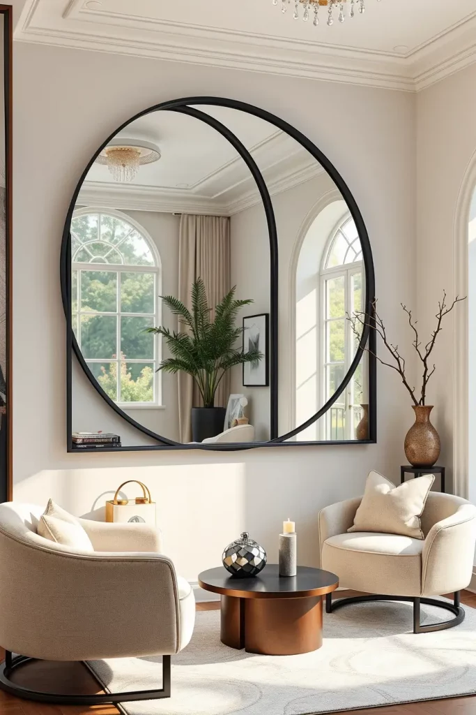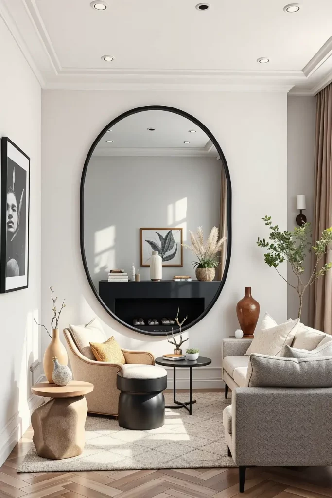 Another trick that I have always liked to use in the small living rooms of apartments is to make the rooms look bigger using oval mirrors. These curves are soft and help to create an elegant movement and reflect light of the windows and lamps. The size of the oval mirror opposite the natural source of light can easily increase the apparent size of the room and brighten dark spots.