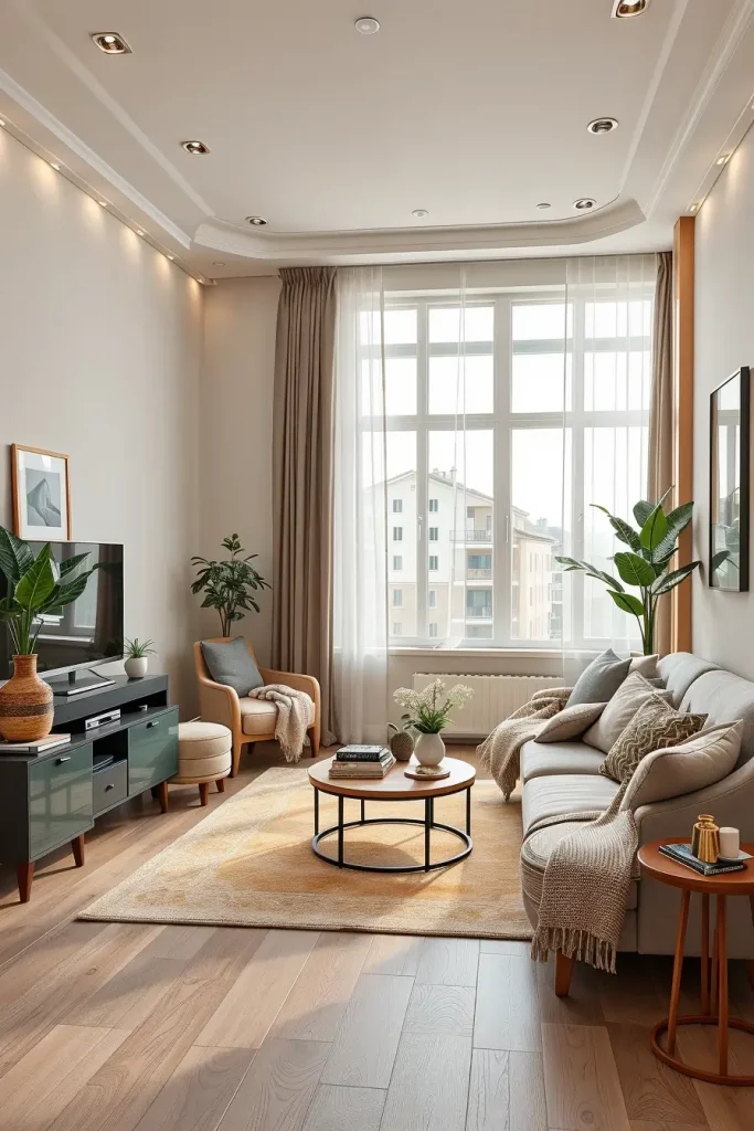 There is one very interesting design trend of small apartment living rooms that I have found fascinating in 2026, which is the revival of the soft rounded formations which make the interior more calming and more peaceful. Rather than straight edges, all the details, including sofas, tables, etc. have rounded and oval shapes, and compact rooms appear soft and flowing. The design solution makes the spaces more comfortable and visually extensive, which is a crucial trick in city residents.