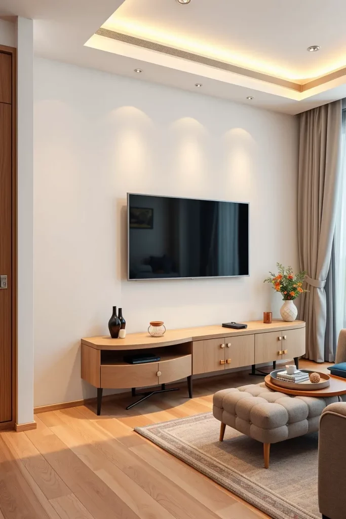I usually prefer wall-mounted units that have drawers or sliding wall panels concealed. Other designer furniture is accompanied with light wood, matte finish, and curved sides. This gives a steady visual rhythmic effect and makes the space appear clear.