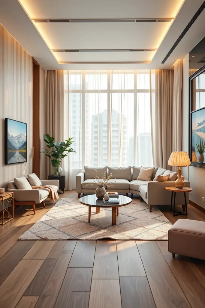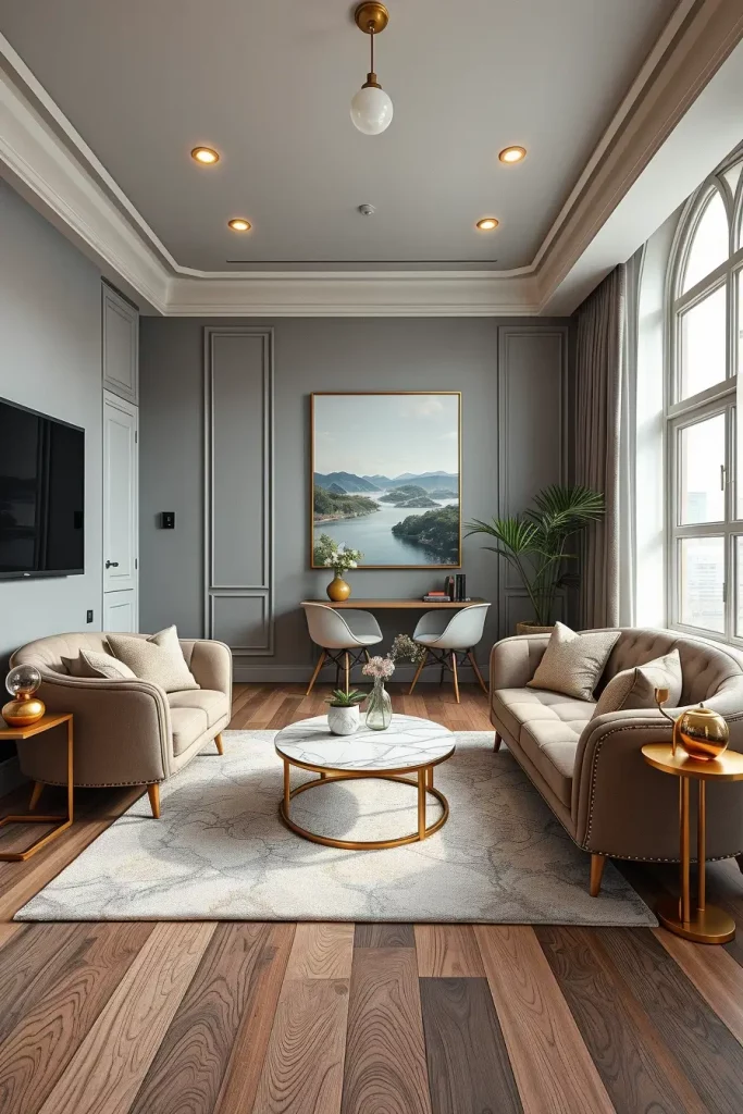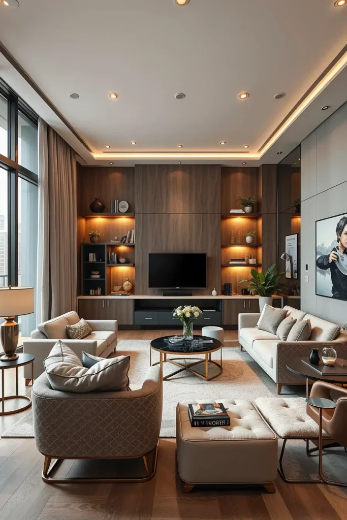 In the case of furniture, I would suggest spending on an elegant curvy sofa with performance fabrics and glass marble-top coffee tables and smooth built-in cabinetry. The use of glass and mirror surfaces increases the sense of space, whereas the elements of brass or chrome can be used as elements of sophistication. Natural wool or silk blends in the rugs provide textual comfort, which helps to enforce the comfortable but elegant design.