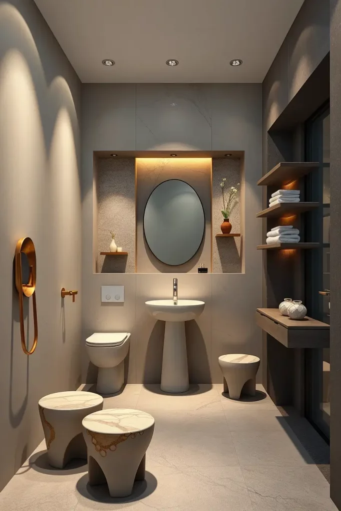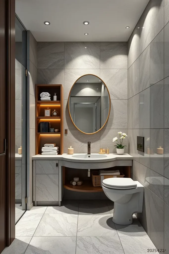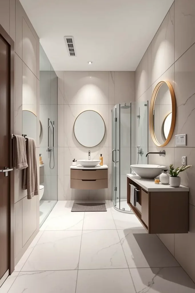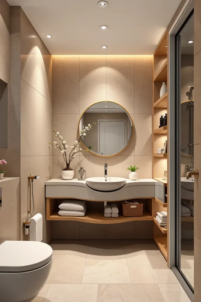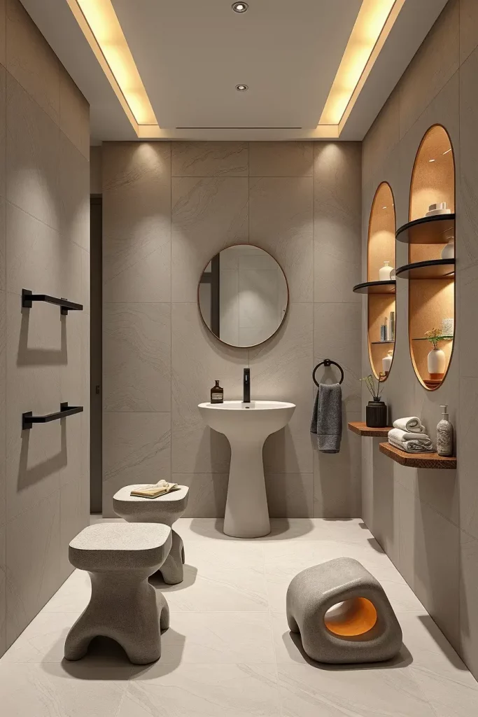 The decor and materials to be used should match this palette. I mostly choose curved vanities with matte taupe, oval mirrors with soft-black frames, and streamlined shelving in dull gray colors. Even the minutest points (rounded soap dishes, sculptural faucets) are the beneficiaries of coordinated coloration. A cohesive palette can be very important in the small spaces, as it is used to take off visual clutter.