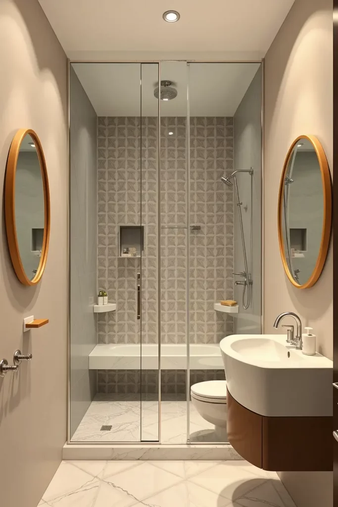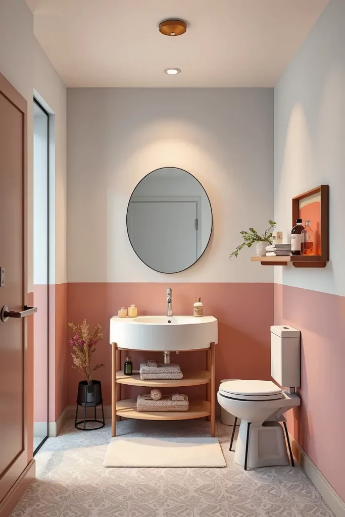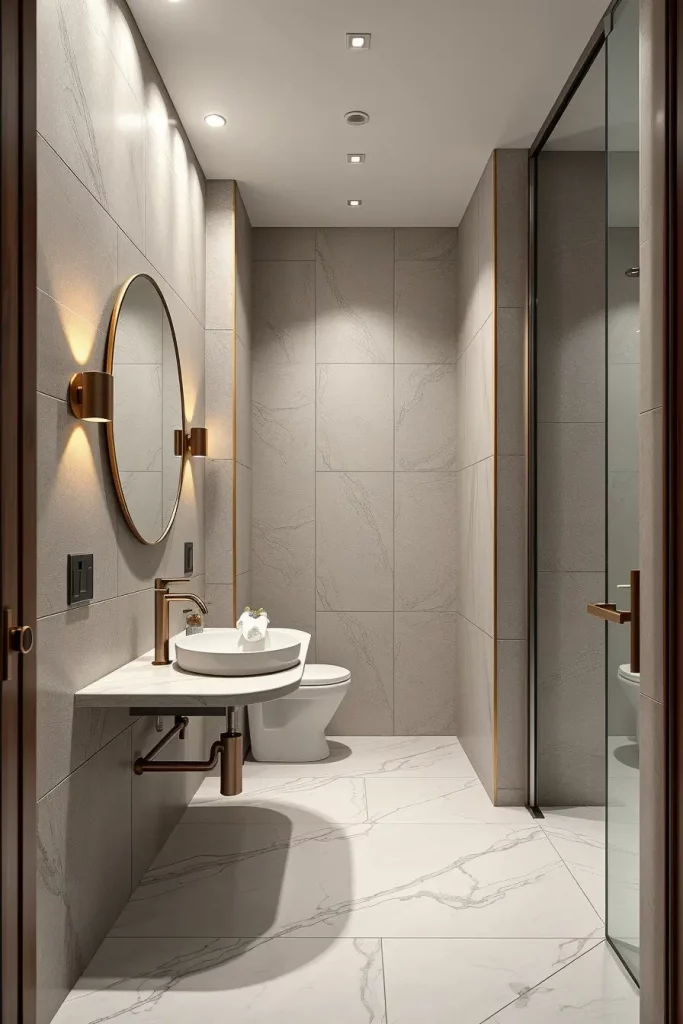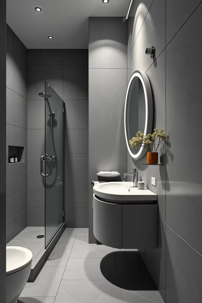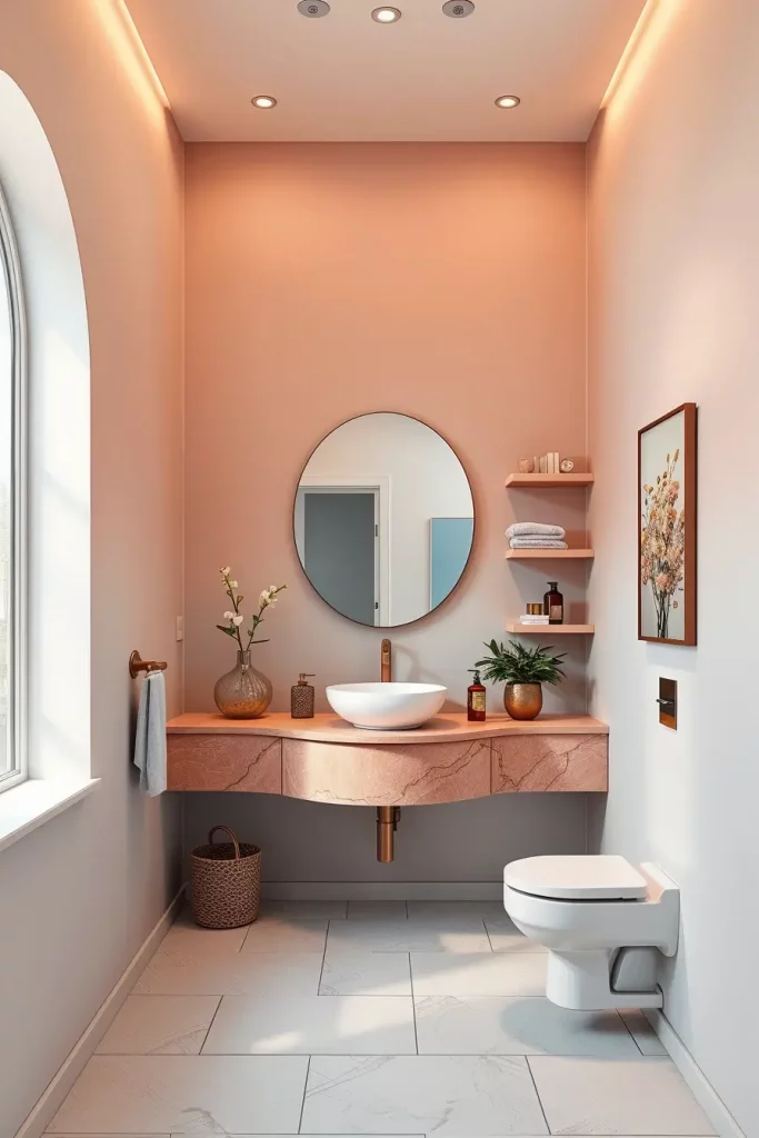 The decor and materials to be used should match this palette. I mostly choose curved vanities with matte taupe, oval mirrors with soft-black frames, and streamlined shelving in dull gray colors. Even the minutest points (rounded soap dishes, sculptural faucets) are the beneficiaries of coordinated coloration. A cohesive palette can be very important in the small spaces, as it is used to take off visual clutter.